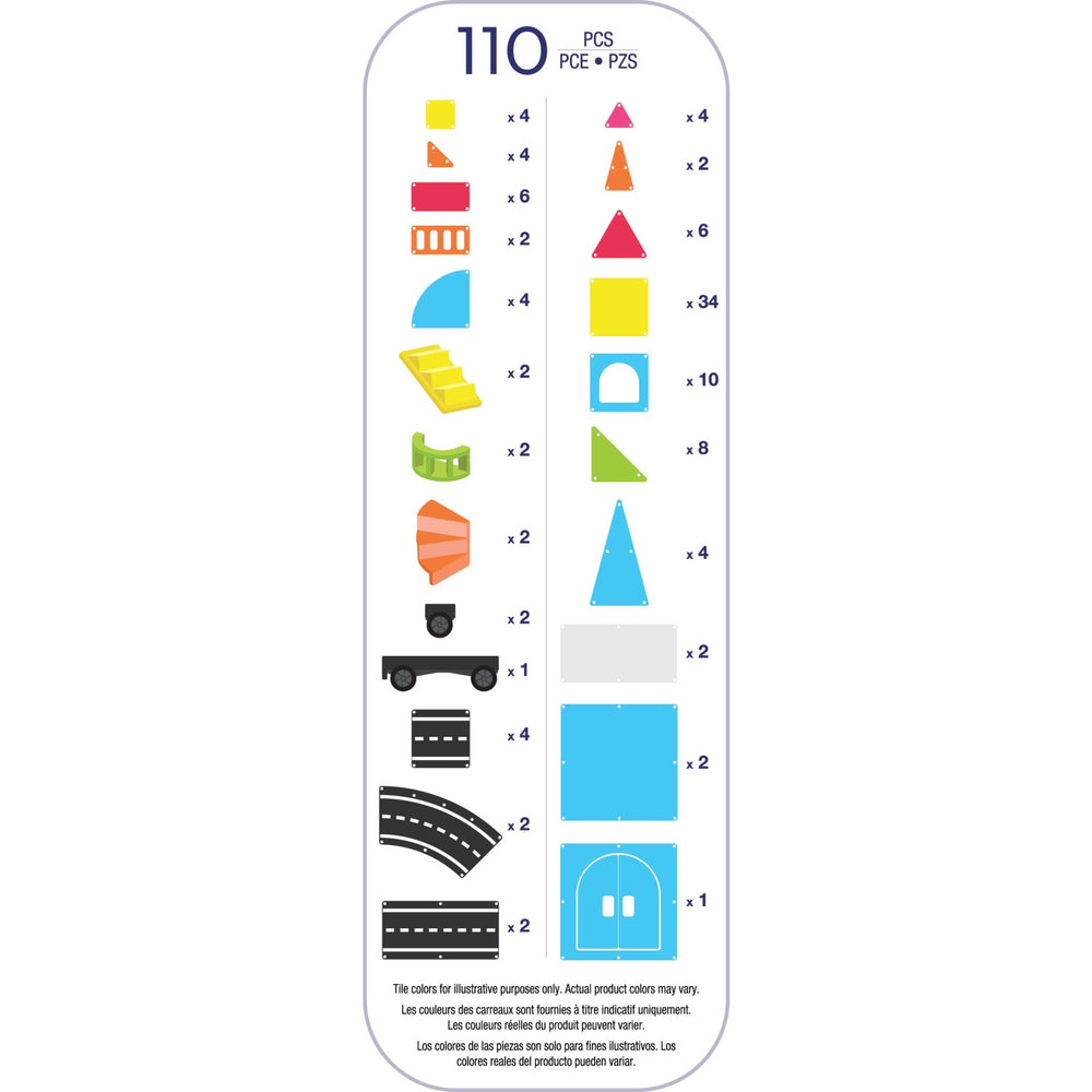 110 magnetic parts – including road sections, spiral and classic staircases, balconies, fences, microMAGS and a car chassis with wheels and axles to bring the city to life.