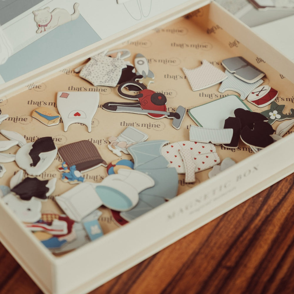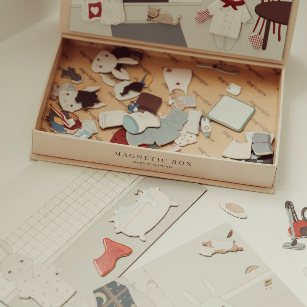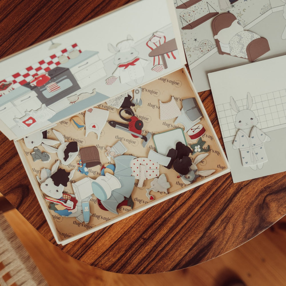 Discover the charming That’s Mine Bunny Lou Magnetic Box, a delightful toy specially crafted for children aged 3 to 8. This cleverly designed magnetic box opens to reveal a magnetic board for endless fun. Featuring 54 accessories, 4 bunny heads, and 3 rooms, it stimulates young minds through imaginative role-play and boosts interaction by promoting engaging dialogue. Perfect for easy storage and on-the-go entertainment, this box ensures safe and educational play for your little ones. Materials: 75% Paper, 25% Magnet Measurements: Length: 19 cm, Width: 26 cm, Height: 4 cm Washing instructions: Wipe with a damp cloth, Do not wash, Do not iron, Do not tumble dry, Do not bleach, Do not dry clean Extra: WARNING: CHOKING HAZARD - SMALL PARTS. Not suitable for children under 3 years.