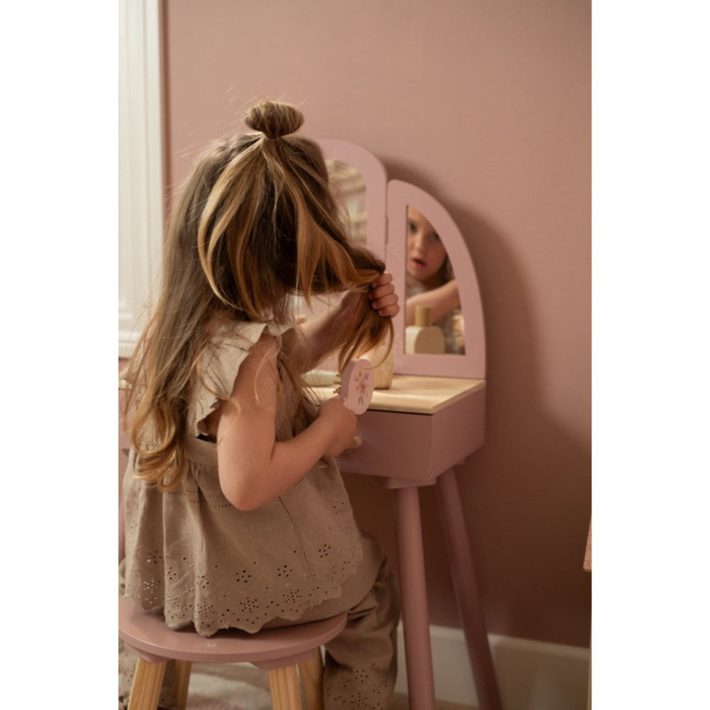 Introduce your child to the world of glamour with the Little Dutch Pink Wooden Dressing Table. Crafted safely with smooth, rounded edges and non-toxic finishes, it is ideal for children ages 3 and above. This delightful set not only enhances their imagination but also offers valuable lessons in organization and responsibility through play. With its compact design, it's easy to place in any room and simplifies storage. Watch as your little princess enjoys hours of creative fun, fostering her self-expression and confidence each day. Age: 3 years Materials: Wood Measurements: 87 x 52 x 27 cm Washing instructions: Surface can only be wiped with a damp cloth. Warning: Not suitable for children under 3 years. Small parts. Choking hazard. To be assembled by an adult.