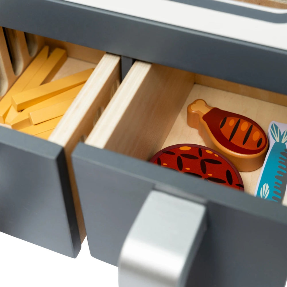 Introducing the MAMAMEMO® Airfryer with Accessories - a vibrant addition to any child’s play kitchen, blending fun with educational value. This toy airfryer boasts an eye-catching "digital" display and comes with two unique drawers, enhancing realistic play. One drawer features closed sides for general cooking, while the other is designed with grooves, ideal for making pretend fries. Equipped with wooden food items like fries, fish, steak, and a chicken thigh, this set not only sparks culinary creativity but also aids in recognizing various food items and their preparation methods. Crafted to foster imagination and teach about kitchen activities safely, its durable construction and easy-to-use design ensure it’s fit for little hands and safe for play. Compact and easy to store, this airfryer set ensures tidying up is as simple as the fun-filled cooking process. Perfect for kids aged 3 and above, the MAMAMEMO® Airfryer adheres to EU toy safety regulations, featuring the CE mark, symbolizing reliability and safety. Let your child explore the joys of cooking in a playful and secure environment with the MAMAMEMO® Airfryer - a delightful way to combine learning with endless fun!