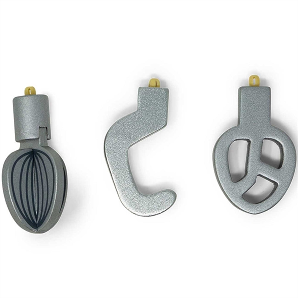 Cookie dough? Bread dough? Do you need to stir a dough together in the play kitchen? Then you can't help but have to have this beautiful mixer with matching white plastic bowl and 3 different mixer blades. The mixer blades can rotate by turning the top handle. In addition, the upper part of the machine can be lifted so that it is easier to remove the bowl. But remember to turn off the machine on the red button at the top, so you don't get your hands on the machine.