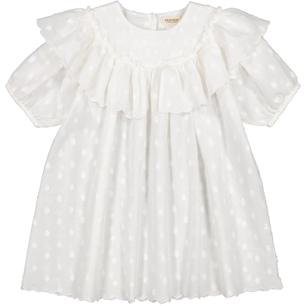 Introducing the delightful MarMar Dobby Dots Gentle White Delsa Dress, perfect for your little one's wardrobe. This comfortable short-sleeved design features a charming collar and secure button-back fastening. Crafted to fall just above the knees, it offers a great fit that allows freedom of movement. The soft, gentle white color, adorned with subtle dots, adds a touch of elegance, making it ideal for any occasion. Easy to care for and designed for lasting comfort, this dress ensures your child looks and feels fabulous all day. Materials: 100% Cotton Washing instructions: Wash - Machine wash 40°C extra gentle, Bleach - Do not bleach , Drying - Do not tumble dry, Ironing - medium, Dry Clean - Do not dry clean Certifications: OEKOTEX, BSCI Extra: 100% Cotton, The lightweight quality makes these styles perfect on warm summer days, Cotton lining, Oeko-tex® - Tested for harmful chemicals