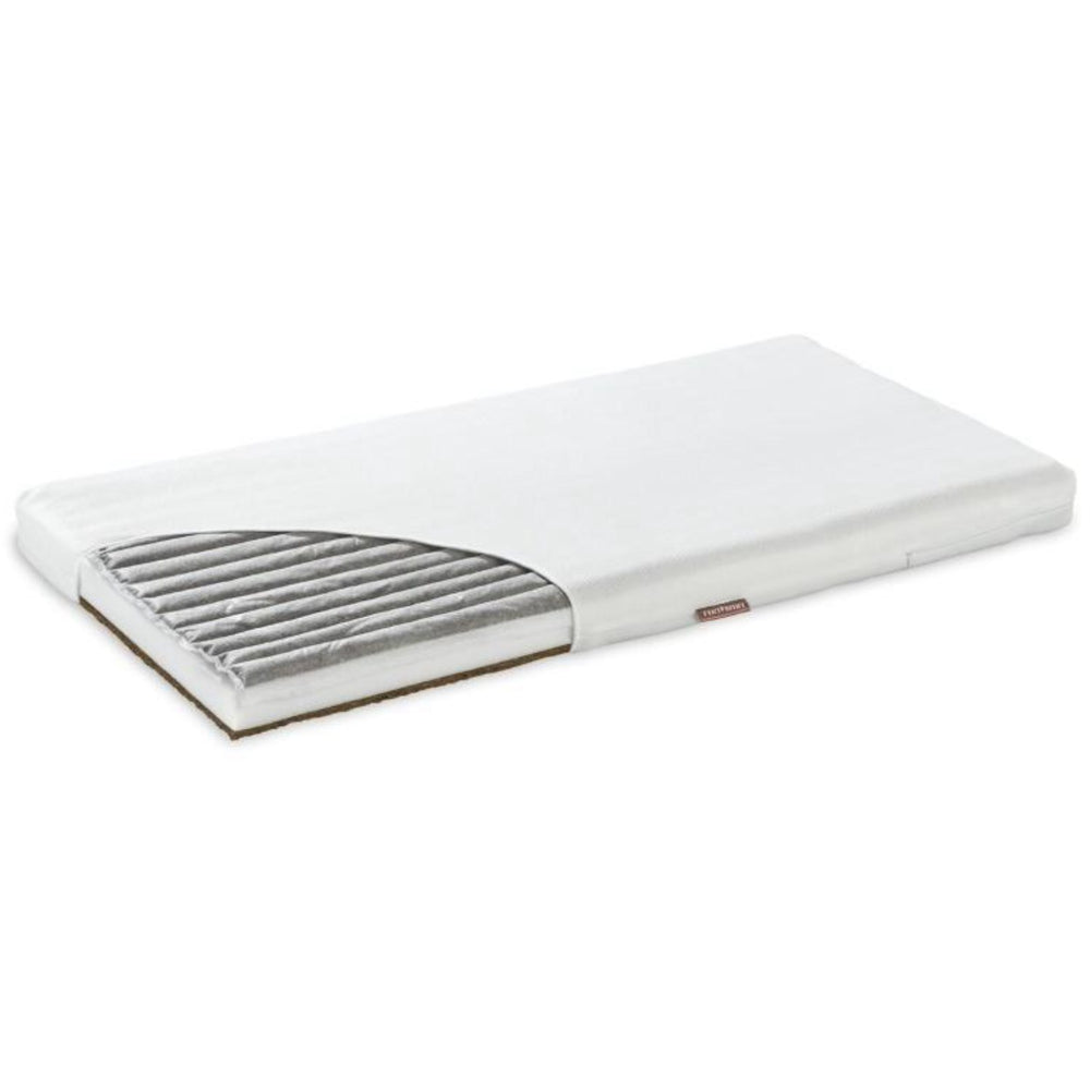 - The mattress is 2-sided. Side with coconut fiber is suitable from 0+ years and side with buckwheat husks is suitable from 8+ months of age.