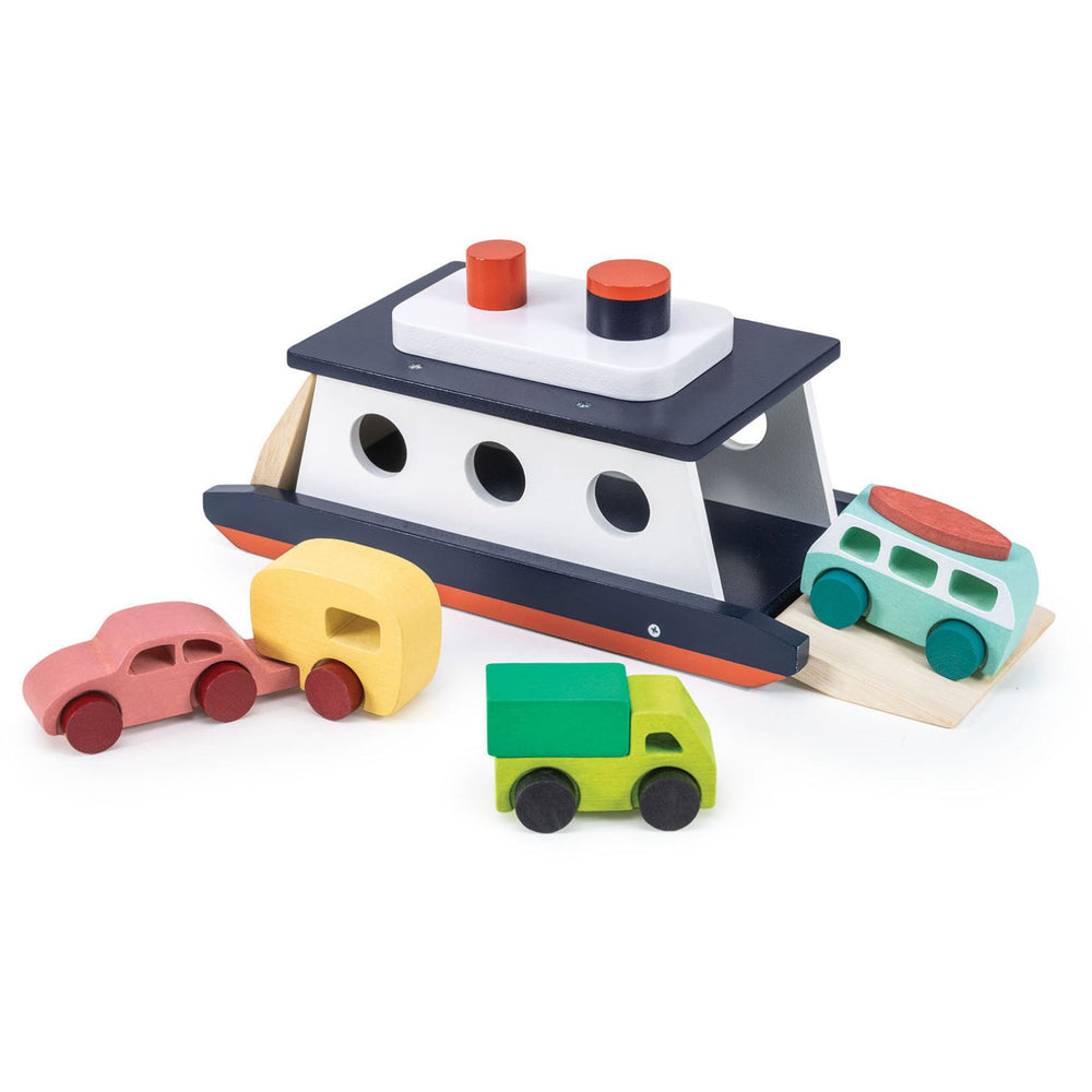 - Car ferry with round windows, 2 chimneys and gangway at both ends to load and unload the 3 accompanying cars