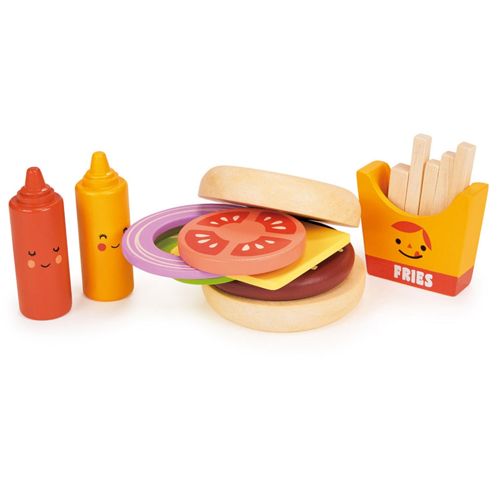 Introducing the delightful Mentari Stort Burger Set, a perfect addition to your child's playtime that combines fun with learning. Crafted from high-quality wood, this toy burger set features multiple components including burger buns, a meat patty, a cheese slice, plus tomato, onion ring, and crisp lettuce pieces for an authentic burger-making experience. Also included are five separate chips nestled in a charming wooden holder, along with tomato and mustard sauce bottles to enhance the play.
