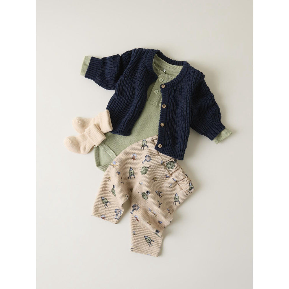 Introduce your child to the epitome of comfort and style with the Name It Cement Nirman Heavy Jersey Pants. Crafted from a heavy jersey that not only provides a lovely drape but also ensures durability, these pants are ideal for both everyday and weekend wear. Featuring a captivating all-over print and an adjustable waist for a perfect fit, these trousers offer a regular fit with a comfortably snug upper part and relaxed legs. Easy to care for, these pants promise to keep up with your child's active lifestyle while keeping them stylish and comfortable. Ideal for various occasions, they'll quickly become a go-to in your child's closet. Fit: Regular Fit Materials: 67% Organic Cotton, 30% Polyester, 3% Elastane Materials and care: Wash with similar colors. Wash inside out Washing instructions: Maximum Washing Temperature 40°C - Normal Process Extra: The main material in this product contains a minimum of 50% organic cotton. Organic cotton is grown without the use of harmful chemicals. Organic cotton farming protects natural resources and biodiversity