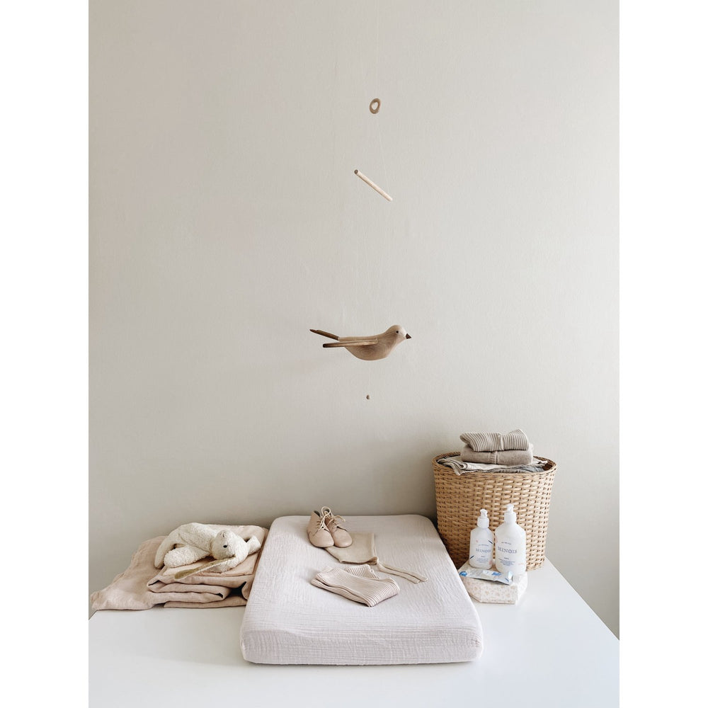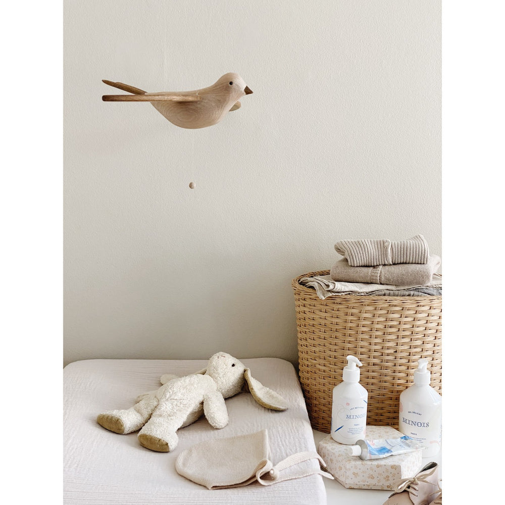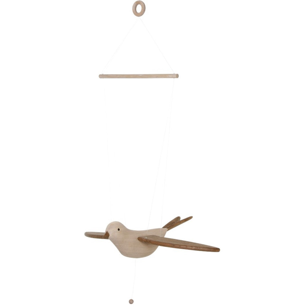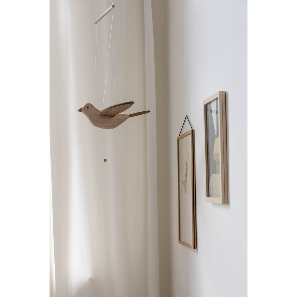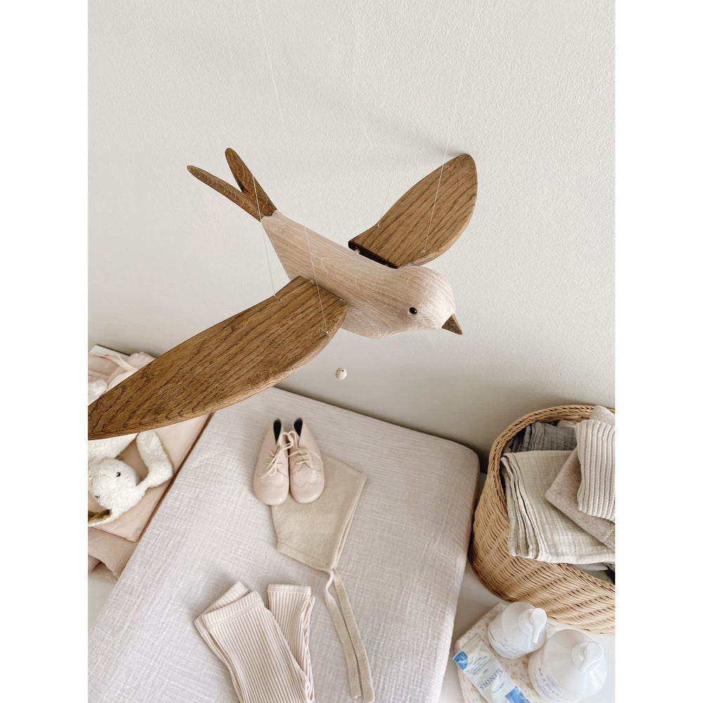 Introduce the enchanting charm of the KAS Kopenhagen Smoked Oak Wings Flying Koko to your child's nursery. This timelessly designed mobile features a classic oak bird, Koko, whose wings gracefully flap when the string is pulled. Perfect for hanging over a cot or changing table, Koko’s gentle movements captivate and stimulate your baby's developing senses, offering both tranquility and visual engagement. Crafted with an eye toward sustainability, the all-natural materials and soft contours echo the beloved mobile designs of the 1980s, while ensuring safety and durability. Although intended purely for decorative use and should be placed out of children's reach, this mobile serves as an ideal addition to create a soothing environment for your baby. Its easy maintenance and slim design allow for effortless portability and storage, making it a lasting treasure in your child’s room.
