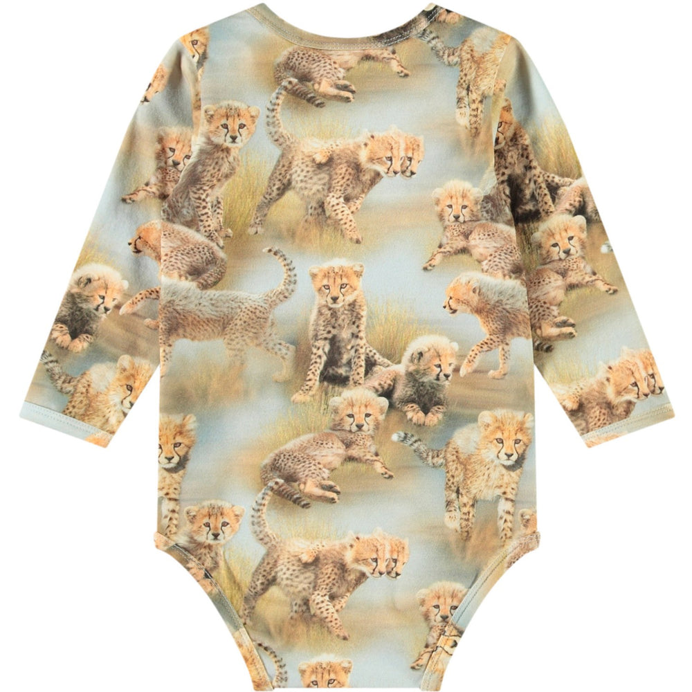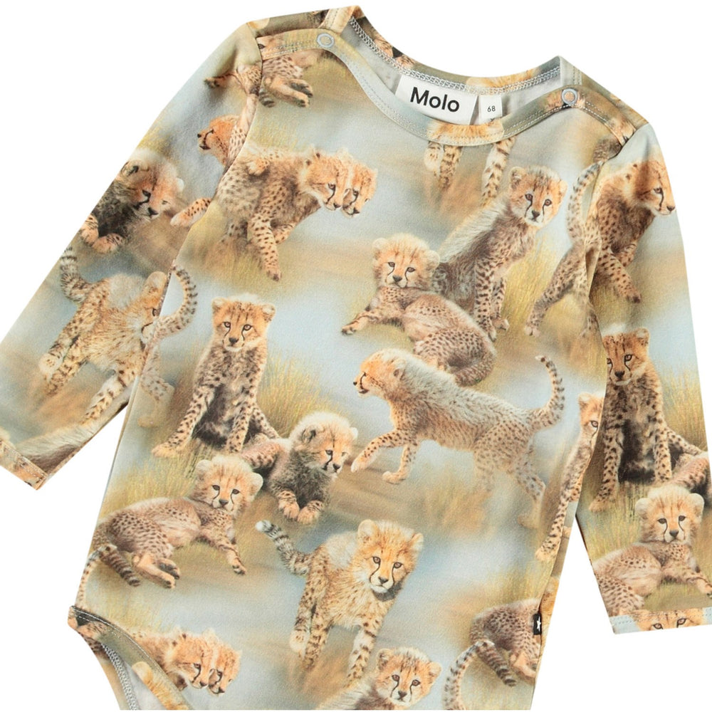 Introducing the playful Molo Cheetah Cubs Foss Bodystocking LS, perfect for your active little one. Crafted from soft, durable fabric, this bodysuit showcases a vibrant cheetah cub design that's as unique as it is stylish. Designed with long sleeves for extra warmth and coverage, it ensures comfort and freedom of movement throughout the day. Ideal for everyday adventures, its easy-care material allows for hassle-free maintenance. A must-have for the fashionable young explorer in your life.