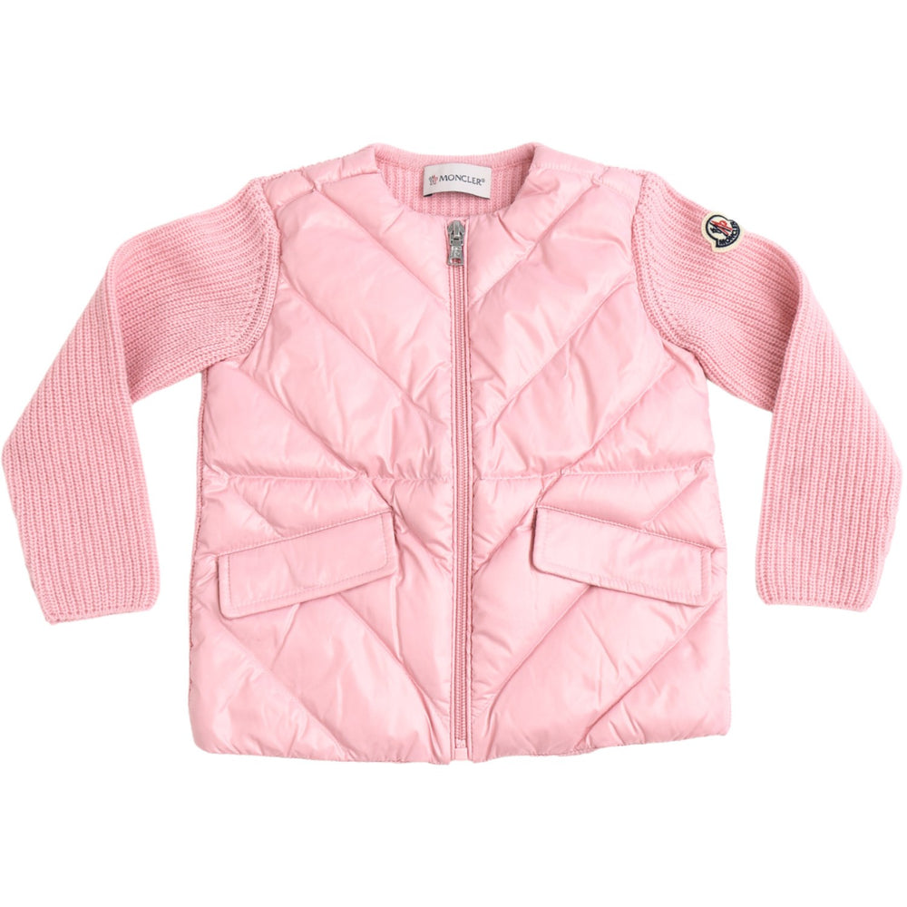 Dress your little one in the Moncler Medium Pink Jacket to keep them cozy and stylish. This jacket features a durable carded wool and nylon laqué blend with a soft cotton jersey lining for added comfort. The down-filled front ensures warmth, while the brioche stitch offers a unique texture. Perfectly finished with a convenient zip closure and practical flap pockets, this jacket combines fashion with functionality, making it ideal for chilly adventures.