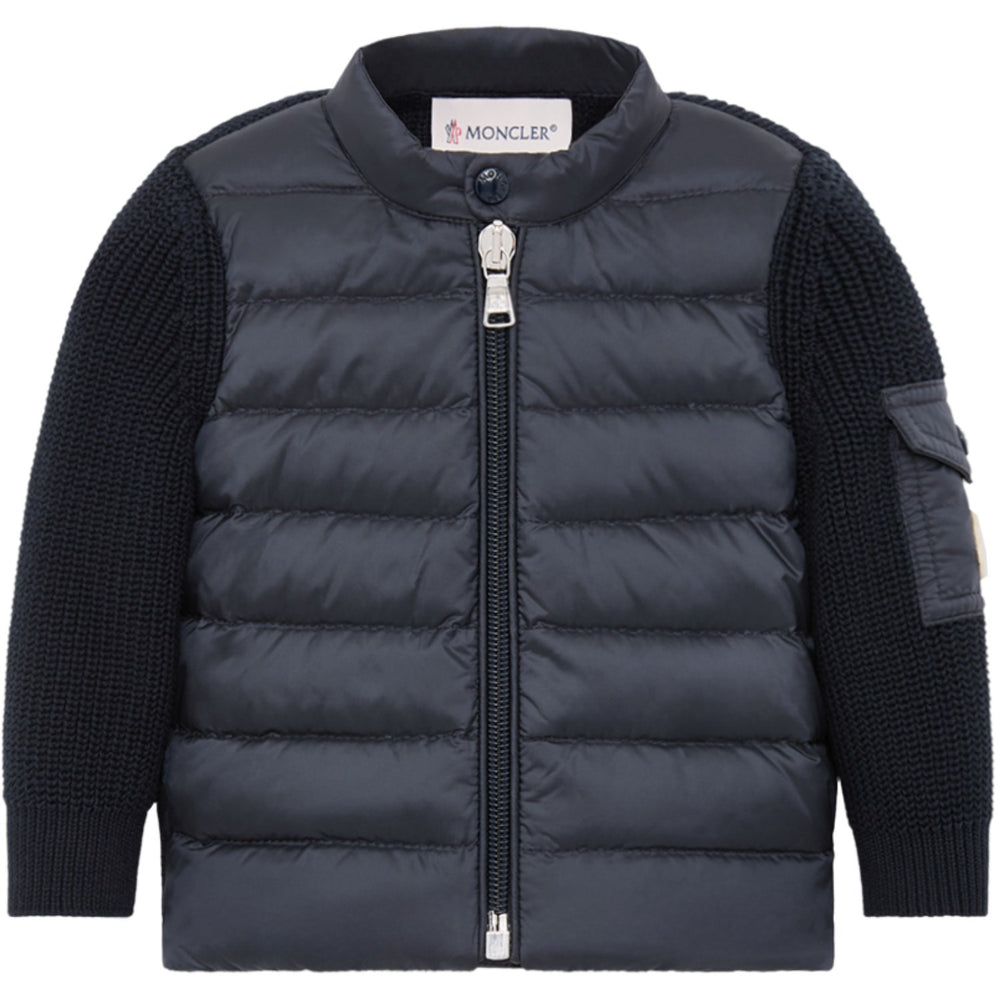 Bundle up your little explorer in Moncler's Navy Cardigan, where comfort meets adventure! This adorable zip-up is lovingly crafted from soft cotton, with a special down-filled nylon front to keep them cozy. Whether it's a crisp fall walk or a cool summer evening, this versatile cardigan doubles as outerwear on those not-so-cold days. It even features a nifty sleeve pocket for tiny treasures! A perfect blend of warmth and style, ready to accompany them on all their little adventures. Materials: Collar: 100%Polyamide/Nylon - Outer Front: 100%Polyamide/Nylon - 1 Material: 100%Polyamide/Nylon - Base Fabric: 100%Cotton, Collar Lining: 100%Polyamide/Nylon - Front Lining: 100%Cotton - Details Padding: 100%Polyester Washing instructions: Hand wash, Do not bleach, Do not tumble dry, Ironing maximum temperature 110°C - without steam, Do not dry clean, Do not professionally wet clean, Flat dry in the shade