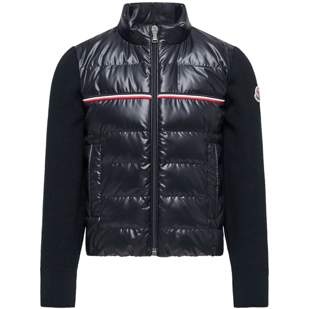 Snuggle into style with Moncler's Navy Cardigan! Perfect for playful adventures and cozy reads, this lightweight cotton cardigan features a puffy down-filled front to keep the chill away. With a sleek stand collar, handy zip closure, and side pockets for little treasures, it's jazzed up by a sporty tricolour stripe. Warmth, comfort, and a dash of flair are all stitched together in this charming piece, just right for your little explorer!