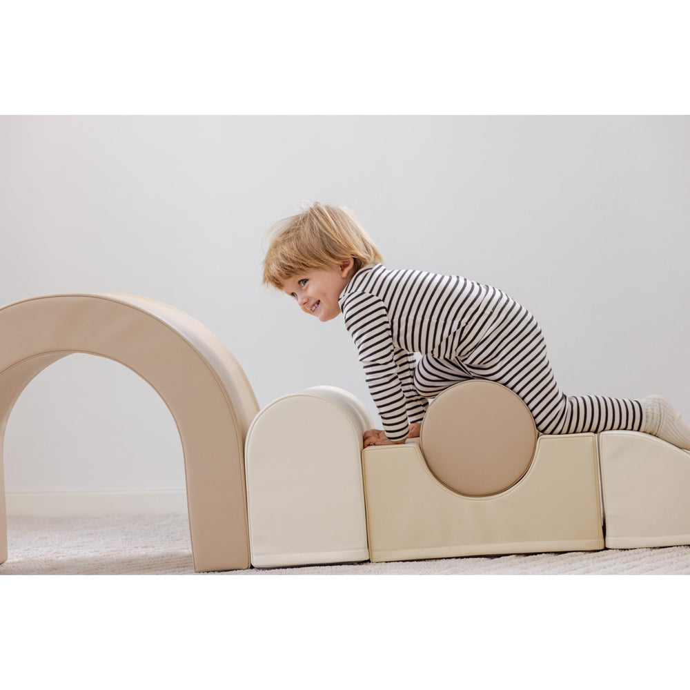 This educational toy features seven unique foam parts, including arches and soft shapes, that provide a variety of playful challenges. Children can explore climbing, crawling, and balancing activities, all while engaging in imaginative play. Made from high-quality, stable foam and covered in kid-friendly vegan leather, the pieces offer a sturdy yet soft surface that is also easy to clean, making it perfect for daily play.