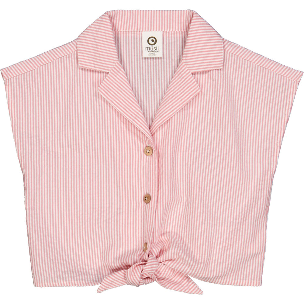 Delight your little one with our Müsli Balsam Cream/Bubblegum Seersucker Stripe Crop Shirt. This charming, short-sleeved crop shirt features delightful pink stripes and an elegant decorative collar, making it a stylish choice for any child's wardrobe. The shirt boasts a playful design with front ties and button opening using eco-friendly sheesham wood buttons, enhancing both its aesthetic and functionality.