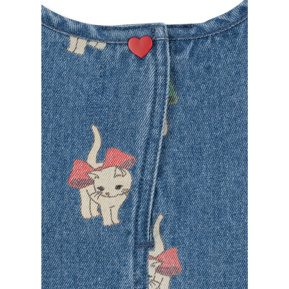 Explore the charming world of children's fashion with the Konges Sløjd Bow Kitty Denim Magot Dress. Crafted from soft, GOTS-certified denim, this dress features a timeless A-shaped silhouette, enhanced by a playful heart-shaped button closure at the back. Its delightful design and comfortable fit make it perfect for both special occasions and everyday play. Ideal for the fashionable young individual who enjoys style without sacrificing comfort.