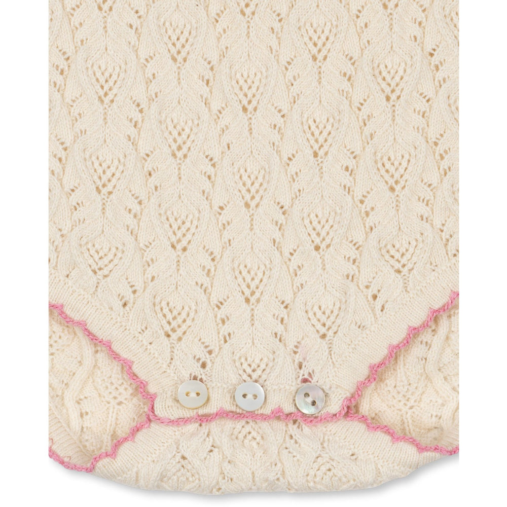 Discover the charming elegance of the Konges Sløjd Off White Rosier Romper, perfect for summertime. This knitted, short-sleeved piece is lovingly crafted from a sumptuously soft blend of cashmere, wool, and cotton. Adorned with delicate embroidered rose details, it also features practical mother of pearl buttons at the leg openings and back, ensuring easy dressing. The timeless off-white color and subtle pattern adds a touch of sophistication, making it as stylish as it is comfortable. Ideal for gentle washes, this romper combines functionality with a dash of luxury, promising both style and ease for your little one's adventures. Materials: 94% COTTON 3% WOOL 3% CASHMERE
