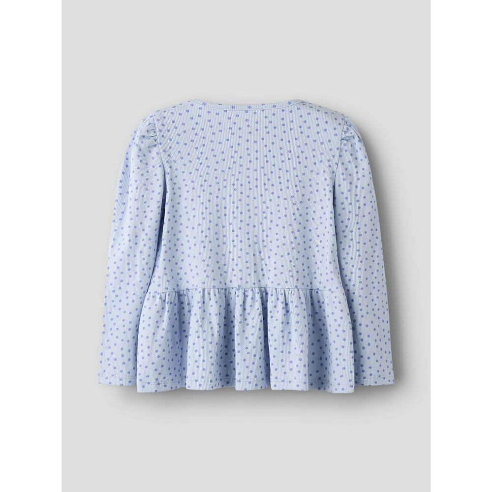 Introducing the Name It Xenon Blue Nmftenna Ls Top Pb, an ideal choice for your child's wardrobe that blends everyday practicality with charm for special occasions. Crafted from rib knit fabric, this top features a vertical striped pattern and excellent elasticity, ensuring comfort and a classic appearance. It’s designed with long puff sleeves, a round neck, and enhanced with a peplum detail, adding a stylish flair. This top showcases a delightful allover print and maintains a regular fit for easy movement. Perfect for your little one, it promises both durability and effortless style.