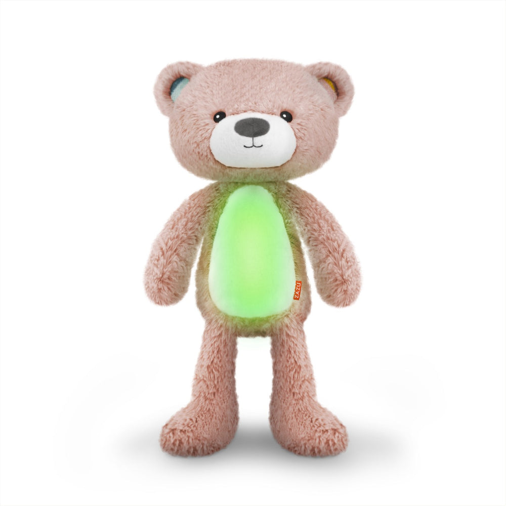 Delight your child with the Zazu Pink Brody the Bear Sleeptrainer, an adorable plush toy that acts as a sleep trainer, nightlight, and soothing music box all rolled into one. The charming Brody Bear helps toddlers distinguish between night and day, easing bedtime routines with a calming red light from his belly that signifies it's time to sleep. Featuring an innovative color change system, Brody turns orange to signal morning is near and shifts to green when it's fully acceptable for your little one to get out of bed. Beyond being a practical sleep aid, Brody is designed with your child's safety and comfort in mind. Made from soft polyester and rigorously tested to meet international safety standards, it’s both cuddly and safe. For parents' convenience, Brody's volume and brightness are adjustable, and he's easy to clean by simply removing the sound and light module. Brody’s built-in features stimulate learning; his simple color-coded system teaches young children about the concept of time in a way that they can easily grasp. Plus, the bear includes a cry sensor, automatically lighting up at the sound of your child’s cry to provide immediate comfort overnight. Let Brody the Bear join your family and transform both bedtime and mornings into smoother, more enjoyable parts of the day.