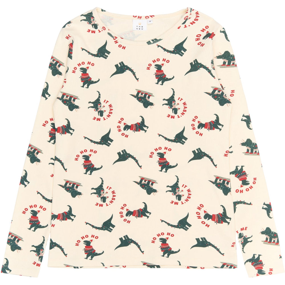 Discover the delightful New Gardenia Dino AOP Holiday Adult Rib Night Set, a must-have addition to your holiday wardrobe. Crafted from GOTS-certified organic material, this ensemble promises both sustainability and comfort. The set features a charming design with two cheerful print options: mischievous cats donning Santa hats, and vibrant dinosaurs engaging in festive fun, complete with humorous phrases like "ho ho ho" and "it wasn’t me." Tailored for a regular fit, the set includes a cozy long-sleeved blouse paired with matching leggings, ideal for ensuring warmth and comfort through the night.