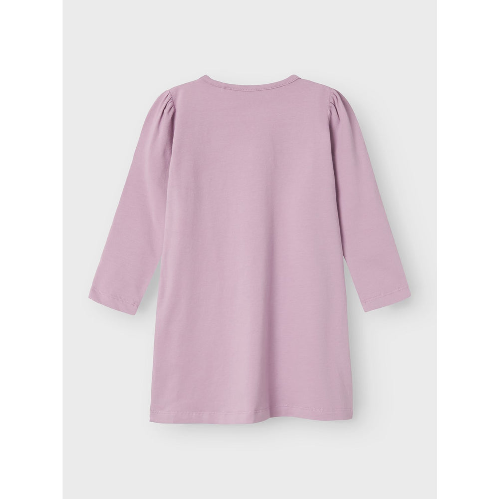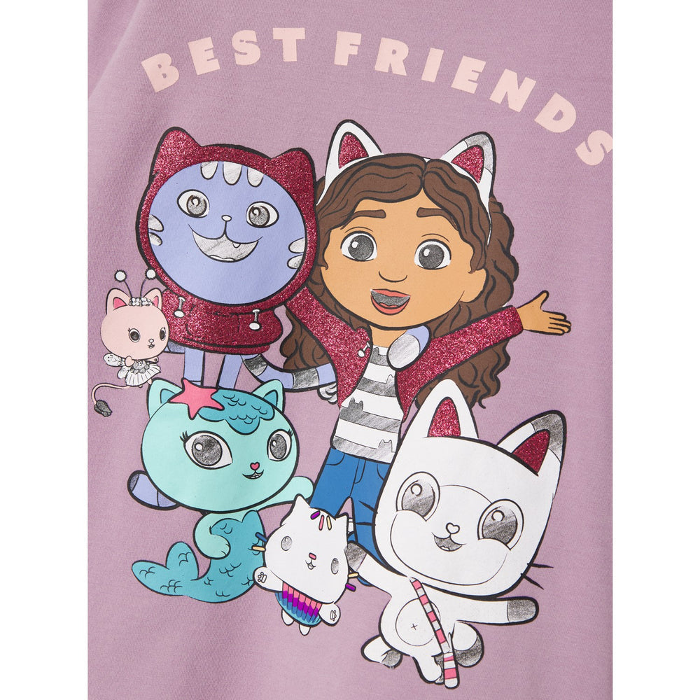 Delight your little one at bedtime with the adorable "Name It Lavender Mist Nenna Gabby's Dollhouse Nightgown." Crafted from soft, lightweight jersey, this night dress ensures a cozy and snug fit, perfect for a restful sleep. The fabric is not only stretchy but also gentle on the skin, allowing unhindered movement throughout the night. This charming nightgown features puff sleeves and sparkling glitter details that add a touch of magic to bedtime routines. Adorned with a soft rubber print depiction of Gabby's Dollhouse, it brings the vibrant, cheerful essence of the popular Netflix series right into your child's bedroom. The pleasing lavender mist color paired with the playful pattern makes this piece a favorite amongst little fans. Designed for durability and easy care, the nightgown holds up well to regular washing, maintaining both its color and shape. Whether it's for sleeping or lounging during a family movie night, this nightgown is not just about comfort but also stirs imagination and fun, making it an excellent choice for your child's nighttime wardrobe.