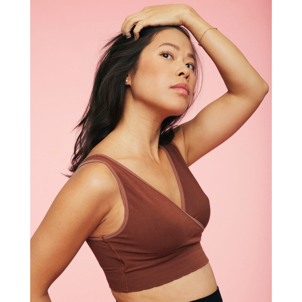 Discover the soothing comfort of the momkind Chocolate Crossover Bra, designed to support both expectant and nursing mothers with ultimate comfort and convenience. Crafted from 81% organic bamboo viscose, this bra is exceptionally soft and friendly to sensitive skin. Featuring a wide band and high U-shaped back, it ensures stability and ease of wear.