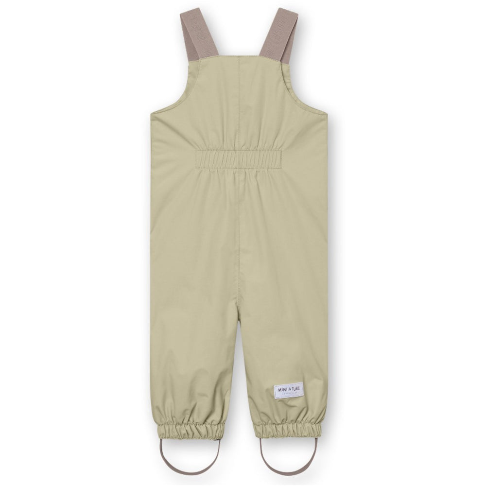 Introducing the MINI A TURE Elm Green Walentaya Spring Overalls, the ideal attire for young adventurers. Crafted from GRS-certified durable, recycled nylon, these outdoor pants are not only wind and waterproof but also gentle on the planet. The pants feature a handy zipper in the front for easy dressing and undressing, while the fixed elastic at the back, elastic shoulder straps, and adjustable foot straps offer a snug and comfortable fit. Kids will move freely and stay secure, thanks to the thoughtful design. Highlighted with a subtle MINI A TURE reflex logo on the back of the leg, which shines up to 300 meters, these pants promise visibility and safety in low light conditions. Durable and designed for optimal comfort and functionality, these overalls come with a reassuring 10-year guarantee, making them a wise choice for children up to four years old. Perfect for all their outdoor play, these overalls blend style, safety, and sustainability.