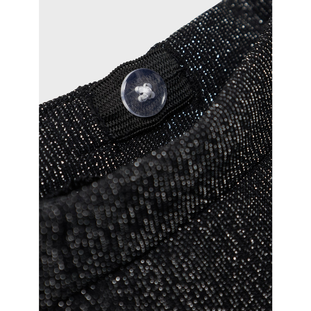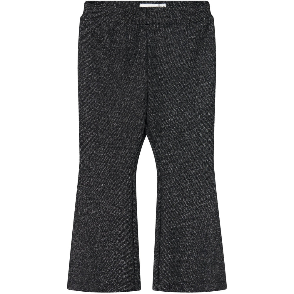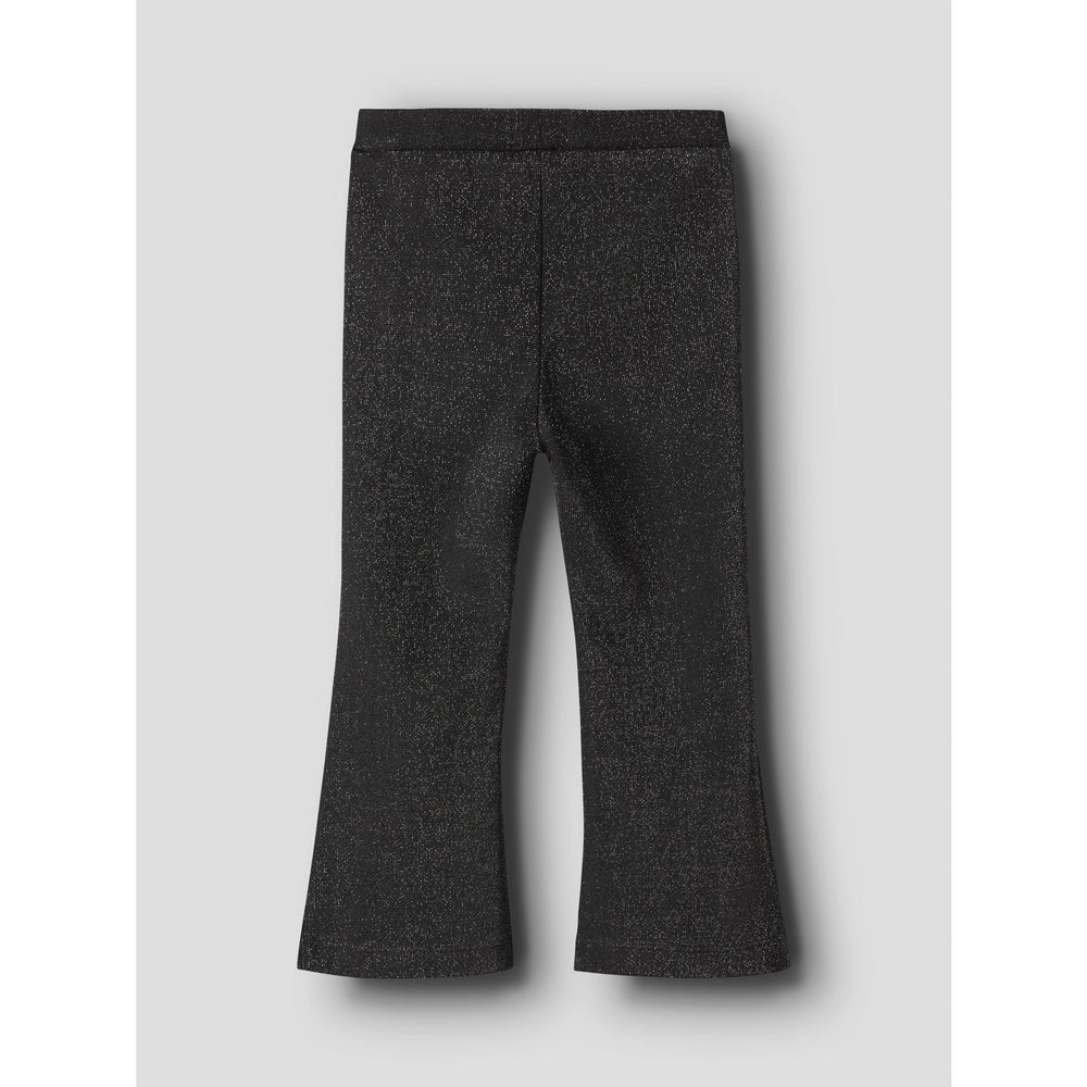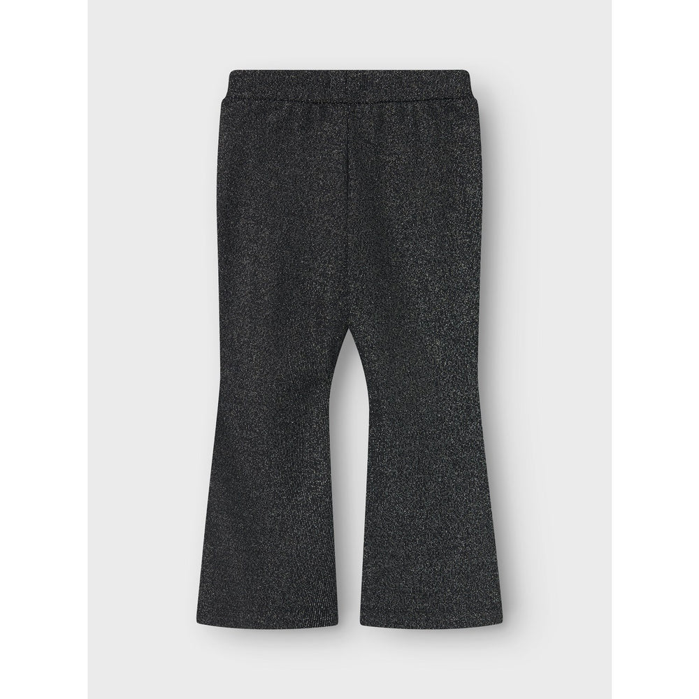 Introducing the Name It Black Roisin Bootcut Pants, designed to blend style with unparalleled comfort for your child. These fashionable trousers are made from jersey, a lightweight and stretchy fabric that not only feels soft on both the surface and inside but also allows complete freedom of movement. Featured in a chic black color with a playful glitter detail, these pants come with a low waist and boot-cut leg style that offers a modern twist to your child's wardrobe. They are equipped with an adjustable waist for a perfect fit, ensuring they grow with your child. Easy to care for and versatile, these pants are ideal for both casual outings and dressier occasions, making them a must-have in your child’s clothing collection.