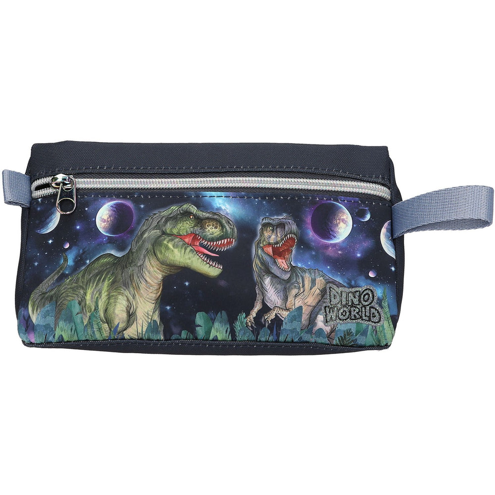 Discover the universe with the Dino World Galaxy Pencil Tube, perfect for young adventurers! This dark blue pencil case features a robust triangular design, showcasing a thrilling motif of two T-rexes in a cosmic setting. It provides ample room for pens in its main compartment, while a flat mesh pocket at the back adds extra storage. Made from durable 100% polyester, it includes an iridescent zip and a handy side loop, combining ease of use and portability with an exciting design that stimulates the imagination. Ideal for school or creative play at home, it ensures all writing tools are organized and within easy reach.
