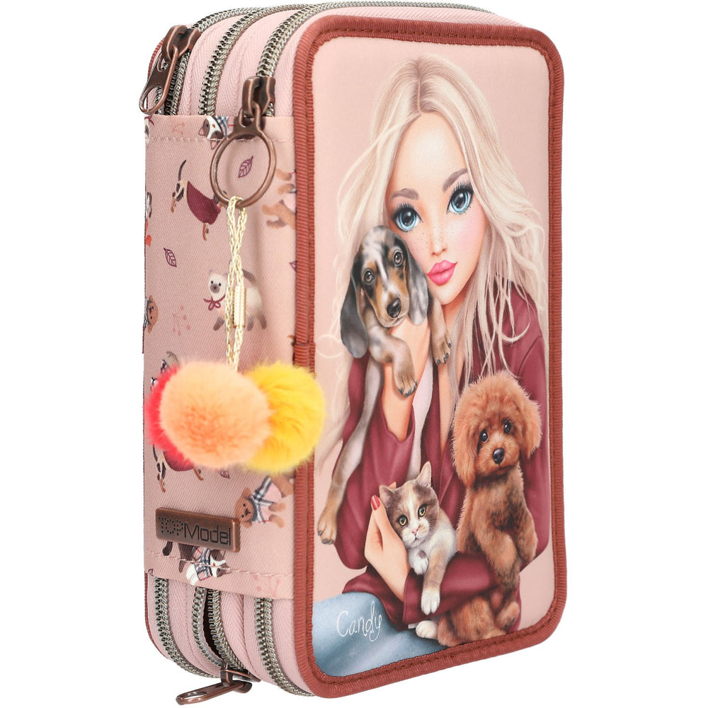 Brighten up your child's school day with the delightful TOPModel Fur Ever Friends Triple Pencil Case! This charming case in soft powdery pink and elegant copper features a large, eye-catching motif of a playful scene with two dogs and a cat. Adorned with an enchanting all-over print of dogs and cats on the back and sides, this pencil case captures the heart of any pet lover.