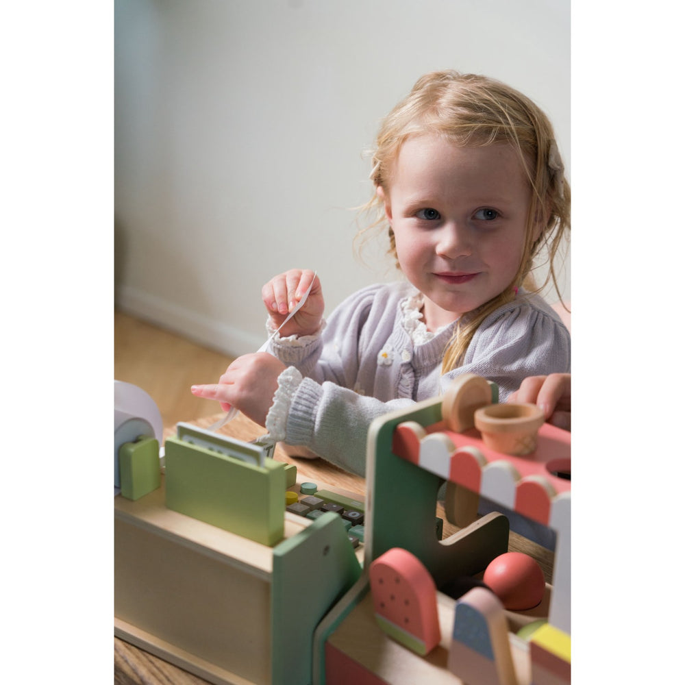 Introduce your child to the enchanting Dantoy Ice Cream Shop, a charming set of 12 wooden play food pieces safely housed in a gift box. Designed for toddlers, it enhances creativity through role-play, promotes hand-eye coordination, and is both easy to carry and store. This educational toy makes cleanup simple, ensuring fun both at home and on the go.