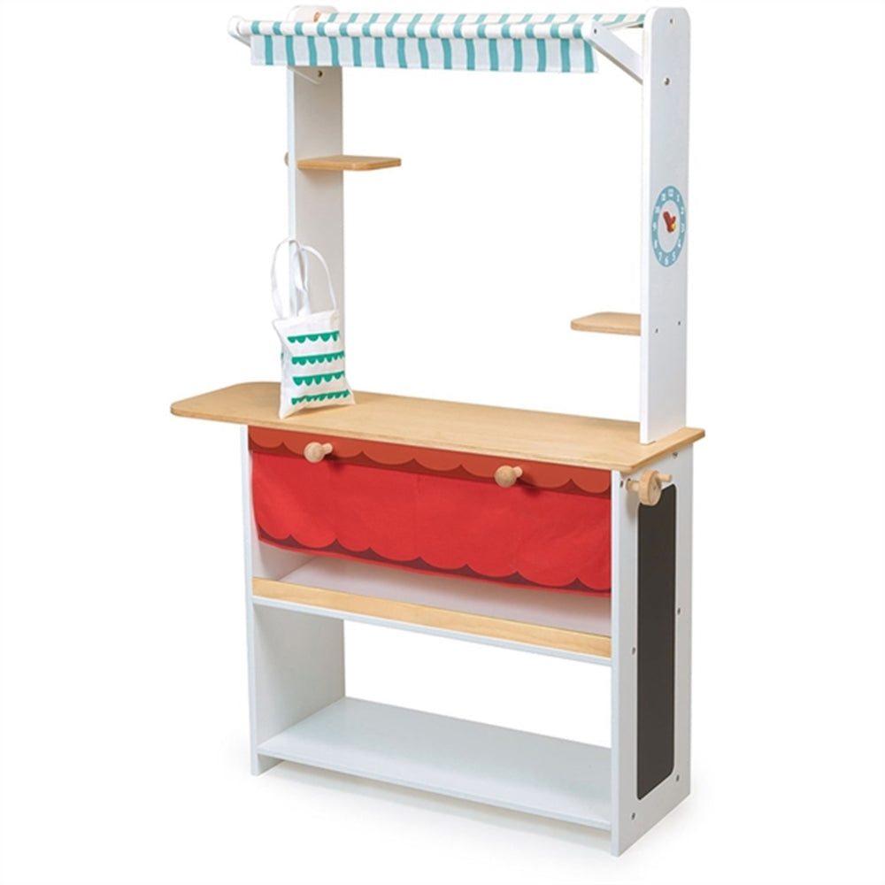 - The stall has a fabric canopy and a pull-up blind to open and close the shop