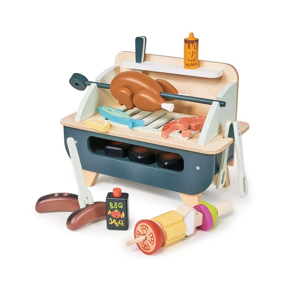 Introduce your little chef to the fun world of cooking with the Tender Leaf BBQ Grill Set! Crafted with high-quality wood, this self-standing barbecue toy setup promises not just fun but also safety and durability. The removable grill and under-grill storage enhance its ease of use and tidiness, offering a quick pack-away feature that saves space and keeps things organized.