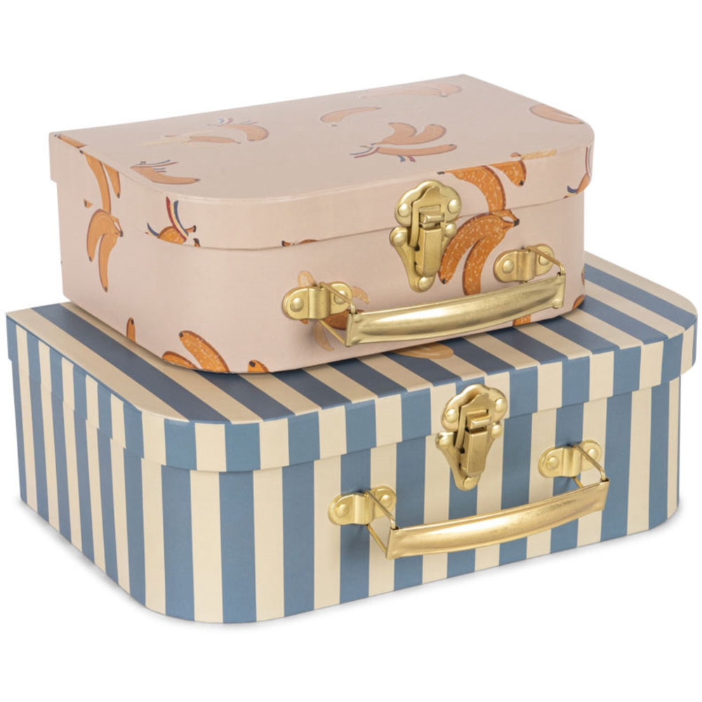 Discover the charm of Konges Sløjd Go Bananas 2-Pack Suitcase FSC! This delightful set features two play suitcases crafted from eco-friendly cardboard, each adorned with playful designs and secured with a sturdy metal handle. Ideal for storing toys or trinkets, the smaller suitcase snugly fits inside the larger one for easy storage. Not only do these suitcases organize spaces, but they also encourage your child’s imagination, offering a stylish and practical solution for both playtime and tidy-up time. Enhance your child's room with both fun and functionality with these adorable suitcases! Materials: Cardboard / Metal Certifications: FSC MIX CREDIT