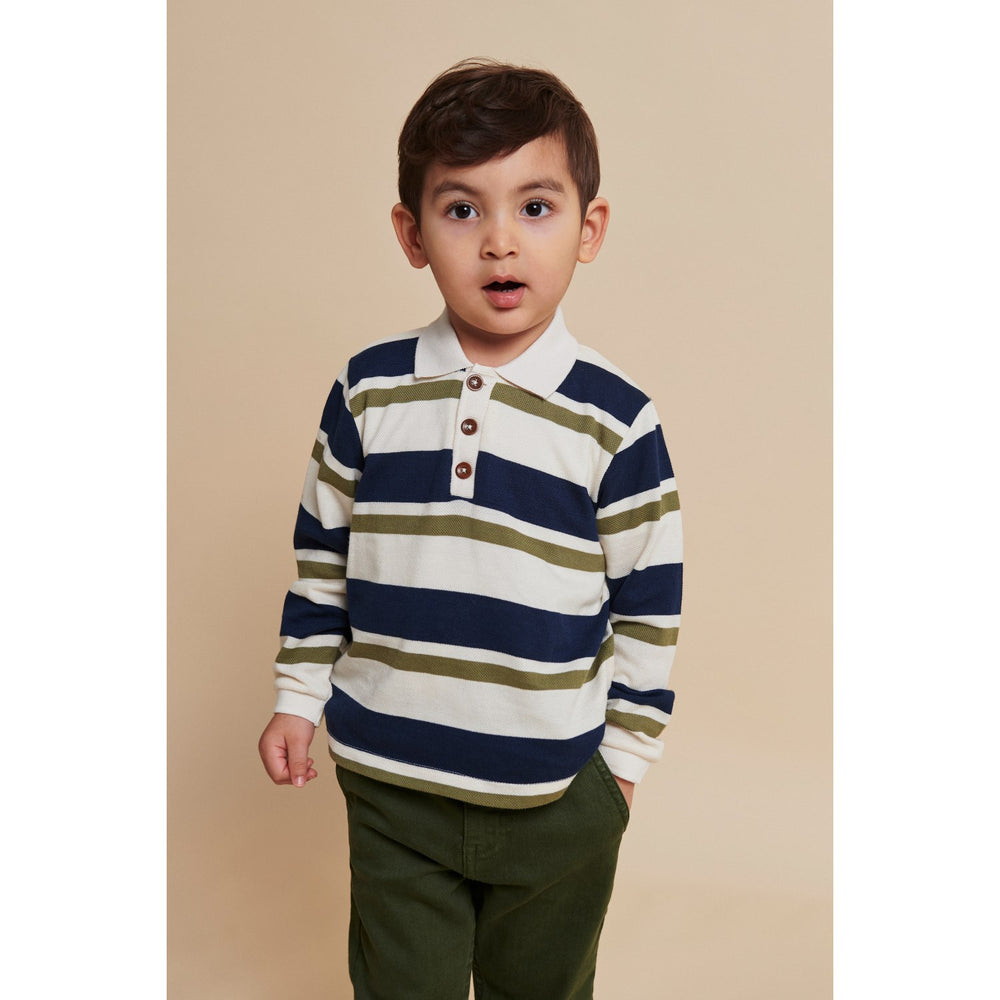 Brighten up your little one's wardrobe with the Copenhagen Colors Green Combi Striped Pique Polo Blouse. Crafted from 100% organic cotton, this polo ensures all-day comfort with its soft and breathable material. The vibrant green stripes paired with the stylish pique texture make it a visually appealing choice for any casual occasion. It features long sleeves and an easy-to-manage button closure at the chest, perfect for quick dressing. Ideal for both comfort and style, this eco-friendly polo shirt makes daily wear delightful for children.