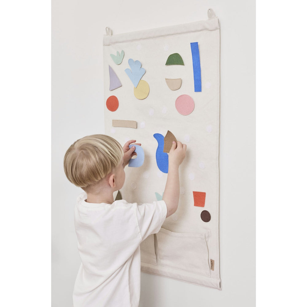 Ensure your child's room blooms with creativity using the OYOY Multi Saga DIY Wall Decoration. Crafted from soft textiles, this charming wall accessory features two handy storage pockets and vibrant, repositionable felt pieces that inspire children to design personalized patterns and stories. Easy to hang with upper loops for telescopic rods, it fosters both neatness and imaginative play while adding a splash of color and fun to your child's space. Perfect for enhancing both decor and developmental skills in any young child's room. Materials: 100% Cotton Canvas Measurements: L0.5 x W50 x H90 Washing instructions: Wipe with soft damped cloth