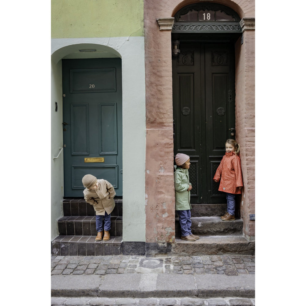 Keep your child dry and trendy with the MarMar Rainwear Green Stripes October Jacket! This long-sleeved raincoat is perfect for exploring the world, even when the rain is falling. With its modern green striped design and functional details such as a detachable hood and adjustable sleeves, this jacket ensures maximum comfort. Made of 100% recycled polyester and equipped with YKK zippers, we guarantee both durability and environmental awareness. The water column pressure of 8000mm and the welded seams keep everything wet out, while the large pockets and name tag on the inside make it easy and convenient for your child to bring small treasures.