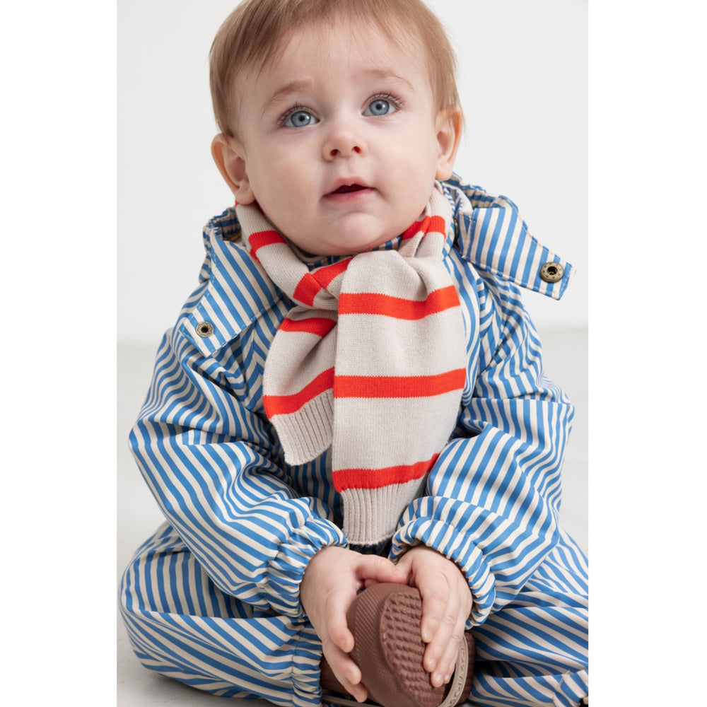 Introduce your child to the joy of outdoor play, no matter the weather, with the MarMar Rainwear Blue Stripe Orion Suit. Crafted from durable rainwear material, this charming suit features a nifty front pocket, a detachable hood for versatile wear, and practical bootstraps to keep everything in place. Its vibrant blue stripe design adds a splash of fun, while the combination of a zipper and snap buttons ensures easy dressing. Perfect for puddle-splashing adventures, this rain suit promises to keep your little one cozy and dry, promoting endless exploration with comfort and style. Materials: 100% Polyester (Recycled) PU coating Washing instructions: Wash - Machine wash 30°C gentle, Bleach - Do not bleach , Drying - Do not tumble dry, Ironing - Do not Iron, Dry Clean - Do not dry clean Certifications: OEKOTEX, GRS, BSCI Rainwear in 100% recycled polyester with PU coating Waterproof (water column pressure of 8000mm) Windproof Welded seams Rib inside the collars, which feel soft on the neck Sleeves have soft lining so they feel soft on the wrists Detachable hood Matching details YKK certified zippers Adjustable silicone bootstraps under the feet Name label on the inside Oeko-tex® - Tested for harmful chemicals
