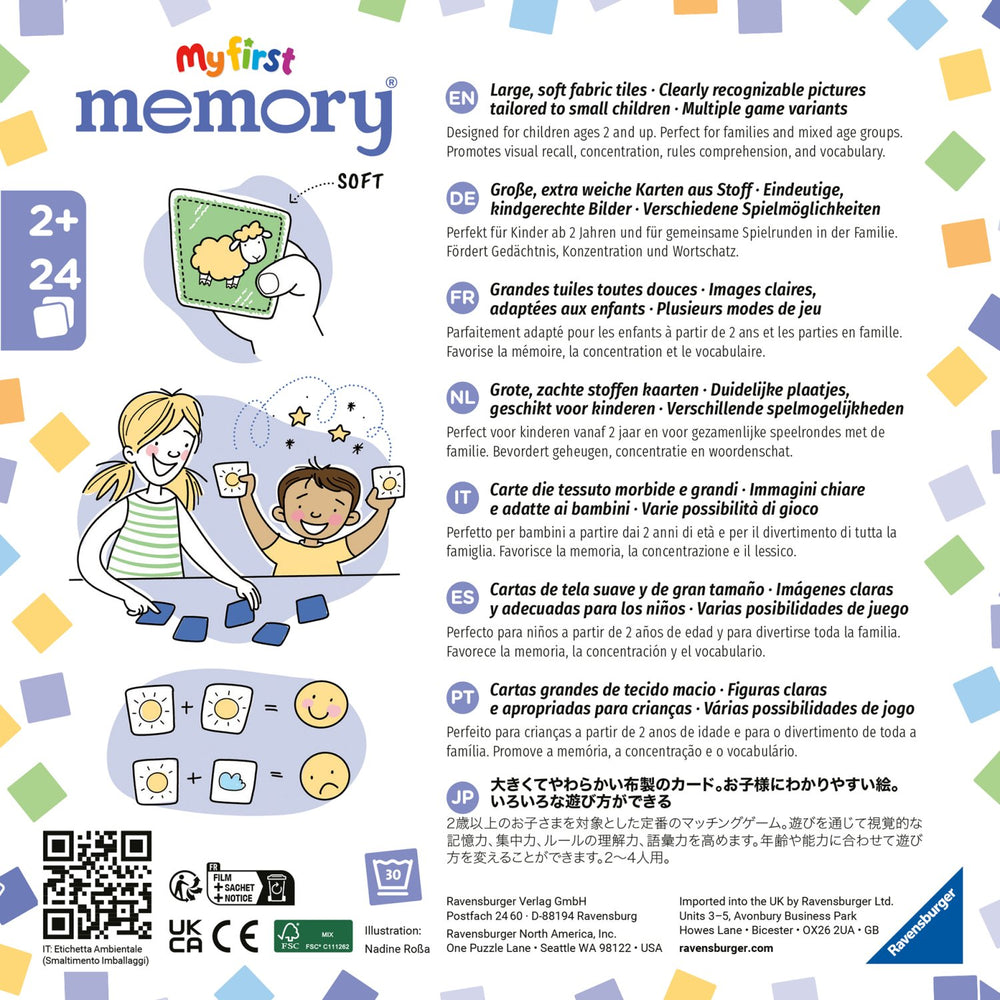 Introduce your little one to the joy of memory games with Ravensburger My First Memory® Animal Babies. Perfect for ages 2 and up, this game enhances memory and concentration in young minds. Featuring 24 soft fabric cards that are washable at 30°, it’s designed for easy use and maintenance. Ideal for small hands, this portable set ensures safe, educational, and engaging playtime anywhere.