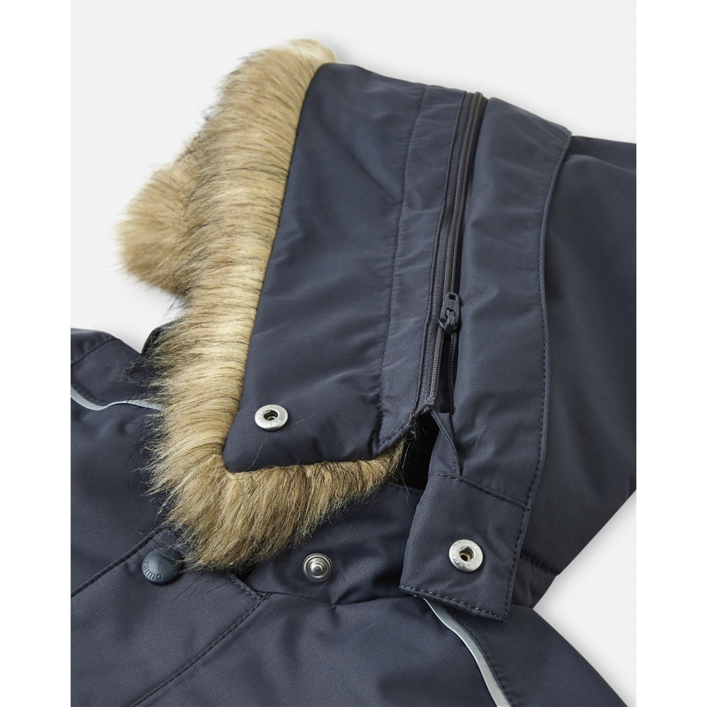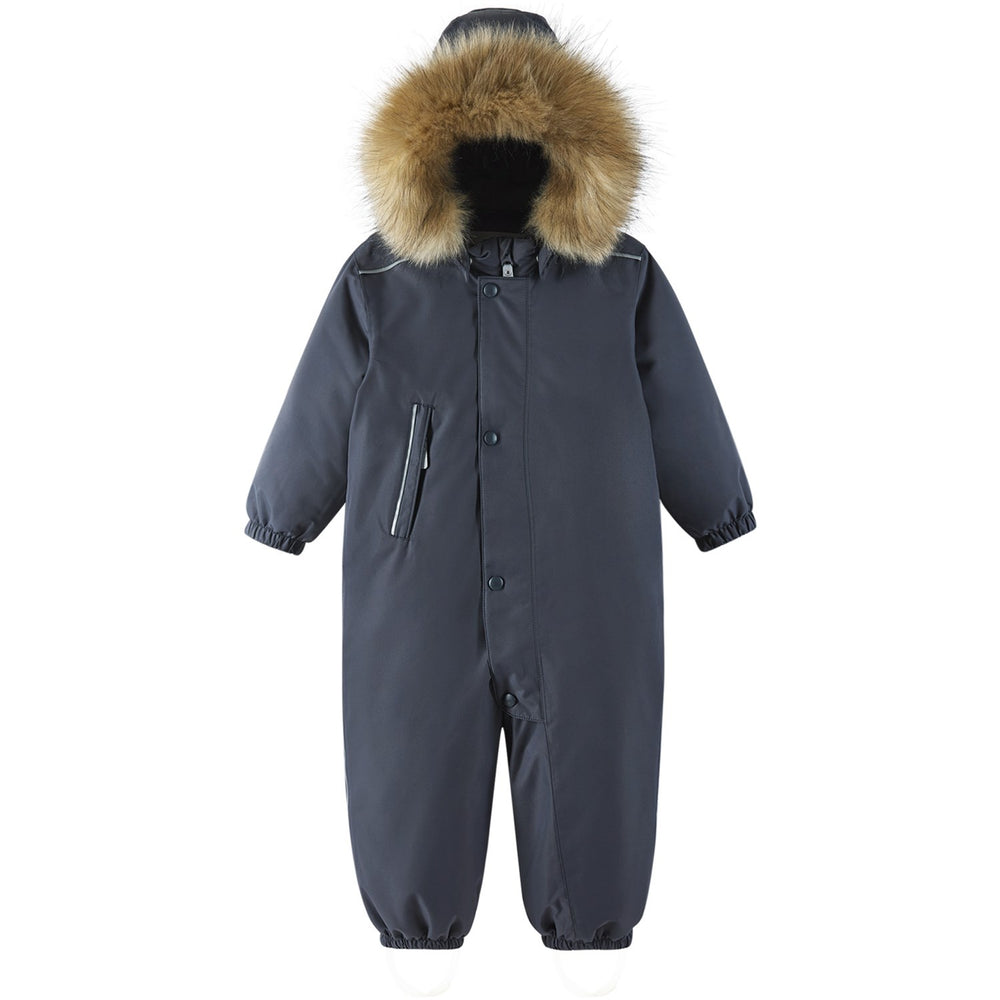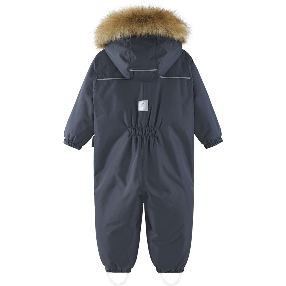 Prepare your little one for winter's fury with the Reima Gotland Soft Black Reimatec Vinter Snowsuit. Inspired by the harsh, snowy conditions of Gotland in the Baltic Sea, this snowsuit is expertly crafted to keep children warm and dry. Featuring advanced ReimaTec technology, it efficiently combats rain, snow, and biting frosts. The snowsuit's design incorporates bluesign® approved fabrics, ensuring it meets rigorous safety and environmental standards. Praised by the Best in Test jury 2023 for its warmth, durability, and ease of wear, this snowsuit guarantees that your child enjoys winter comfortably and stylishly. Perfect for repeated seasonal use, it offers unmatched protection and a secure fit for adventurous toddlers. Breathability: 7 000 g/m2/24 h Detachable hood: Yes Fit: Regular fit Materials and care: Do not bleach. | Iron at low temperature. | Do not dry clean. Outer material: 100% Polyester - recycled, polyurethane coating Taped seams: Yes Washing instructions: Wash separately inside out. | Remove faux fur trim before washing. | Close zippers and Velcro straps. | Use detergent without bleach. | Do not use fabric softener. | Remove from the machine when the program is finished to avoid color changes. | Can be dried in a tumble dryer or drying cabinet (max. 40 °C). Water column pressure (mm): 12 000 mm Waterproof: Yes Wear resistance: 30,000 Martindale Windbreak: Yes Certifications: bluesign® product Extra: Insulated seat cushion, Warm padding, Water and dirt repellent