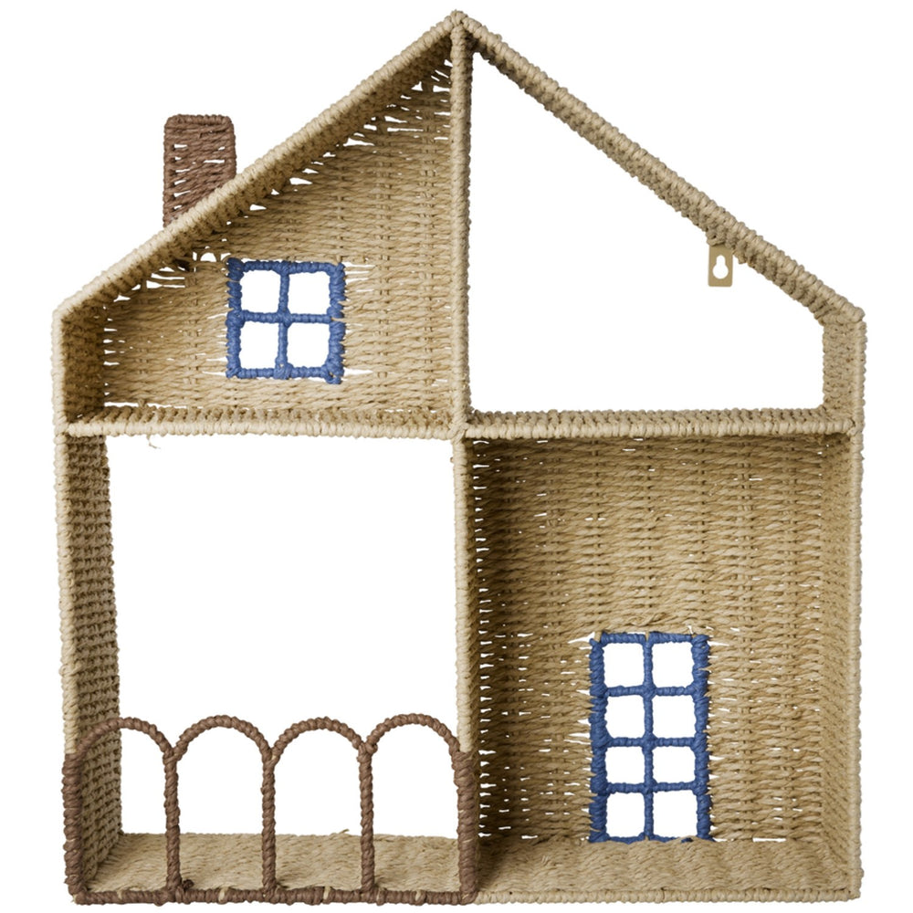 Discover the charm of our House-Shaped Rice Paper Rope Shelf, perfect for your child's room. This durable shelf offers a playful storage solution with its blue accent window and door details, blending functionality with whimsy. It's designed to safely house books, toys, and other treasures, promoting organization and stimulating the imagination. Ideal for fostering a tidy and appealing environment, this shelf makes everyday cleanup a delightful adventure for your little one. Materials: Wire frame, paper rope Measurements: Height: 50 cm, Length: 45 cm, Width: 12 cm Washing instructions: Remember to follow washing and user instructions