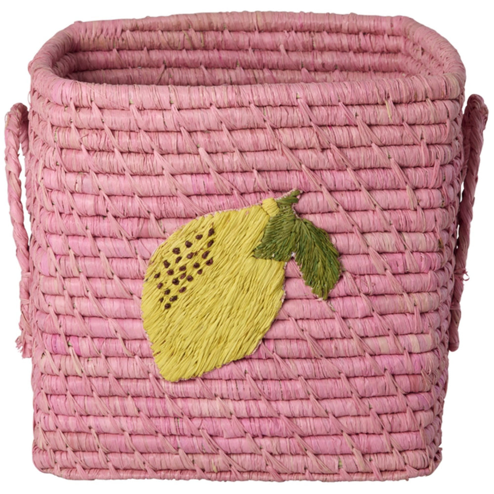 Rice Raffia Square Basket With Big Lemon Embroidery And Raffia Handles - Small