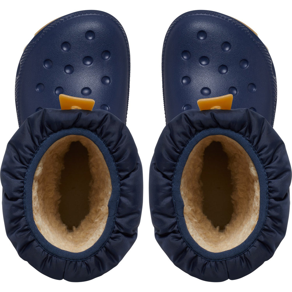 Discover comfort and style for your little one with the Crocs Navy/Gum Classic Neo Puff Boot. Crafted from durable material, these boots feature a chic navy color with a playful pattern. Ideal for growing feet, they offer a snug fit and lightweight design, ensuring easy movement. Perfect for any adventure, their easy-care promise along with reliable traction enriches every step your child takes.