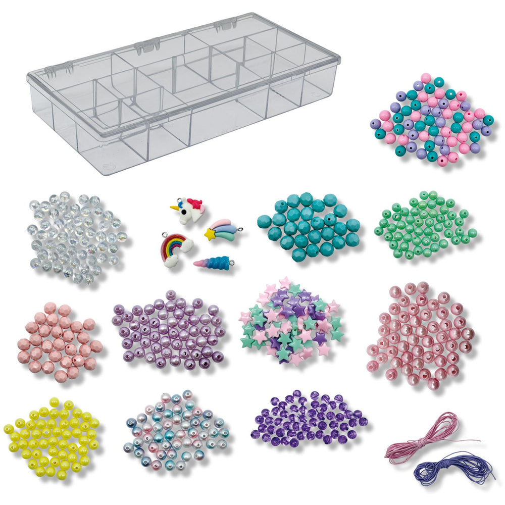 - Jewellery set consisting of a storage box with 12 compartments filled with beautiful pastel and mother-of-pearl beads, including pink-blue mother-of-pearl beads, stars and 4 unicorn pendants