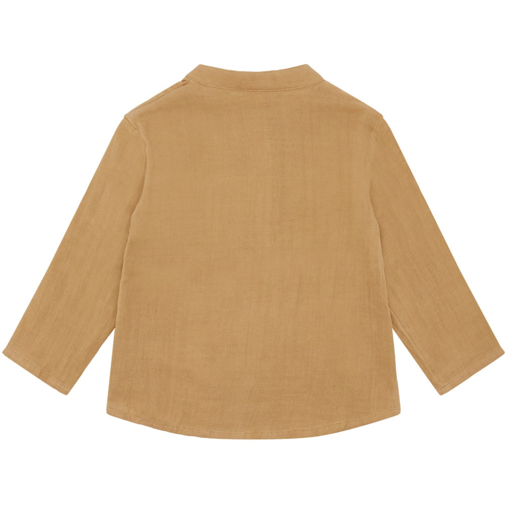 The shirt showcases a pleasant warm sand color, versatile enough to pair with various bottoms. Its design is further accentuated with front buttons, making it not only fashionable but also functional for easy dressing. The organic cotton material not only promises comfort and wearability but also stands up to the rigors of playtime, ensuring durability.