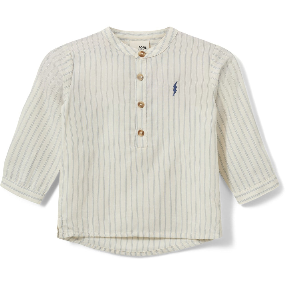 Play discovery in this charming blue striped shirt from Sofie Schnoor! Designed with a comfortable round neck and practical button closure at the front, this shirt makes it both stylish and easy to put on for your child. Long sleeves with cufflinks add a smart touch, while the small embroidered zip on the chest adds a fun and fresh touch. The loose fit ensures maximum all-day comfort for little adventurers. Perfect for both play and special occasions!