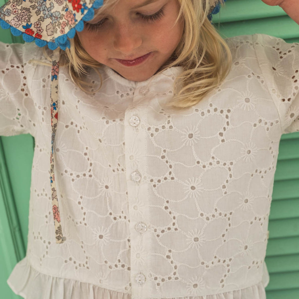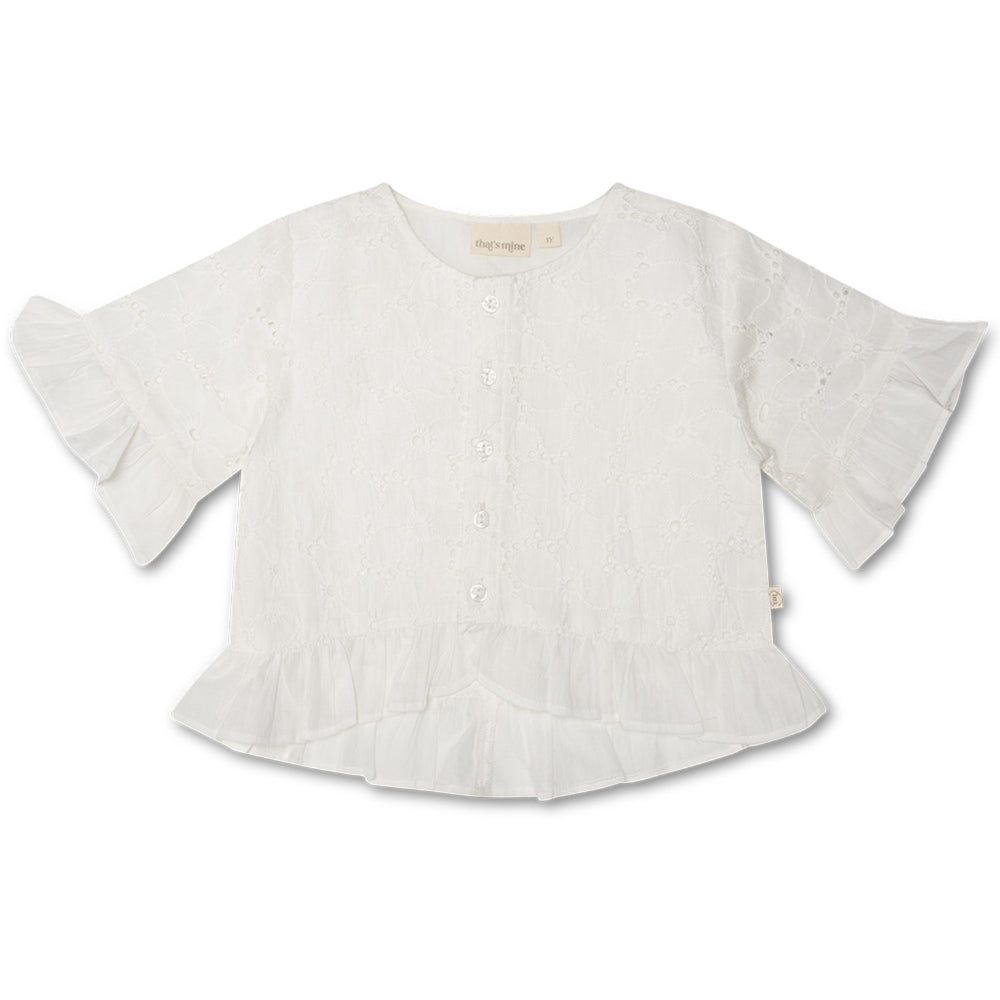 Discover the charm of the That's Mine Brilliant White Ibbi Shirt, perfect for sunny days. This adorable summer top features delightful flounce details and practical front buttons. Its loose sleeves that fall above the elbow enhance comfort without sacrificing style. Crafted in brilliant white, this shirt is as versatile as it is fashionable, ideal for various occasions from park outings to family gatherings. Easy to care for, it promises to keep your little ones both stylish and comfortable. Materials: 100% Organic cotton Washing instructions: Wash warm (max 40°C)