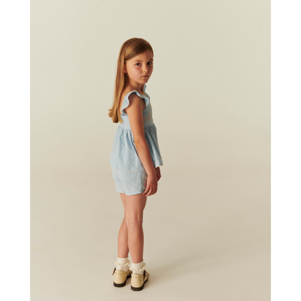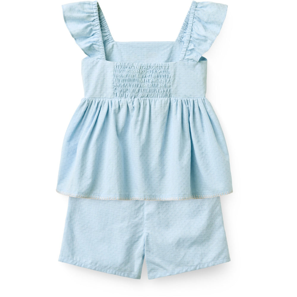 Dress your little one in the delightful charm of the Copenhagen Colors Lt. Blue Comb. Summer Set, perfect for balmy days. This enchanting two-piece outfit is made from ultra-soft, GOTS-certified cotton that ensures durability and comfort. Featuring a sleeveless top adorned with flutter straps and exquisite floral embroidery on the chest, paired with coordinating shorts that boast similar embroidered details at the hem. Available in soothing shades of dusty blue and light rose, this set combines style with comfort and conscious manufacturing, making it an ideal choice for your child's summer wardrobe. Effortlessly machine-washable, it blends practicality with playful design. Materials: 100% Cotton Certifications: Gots