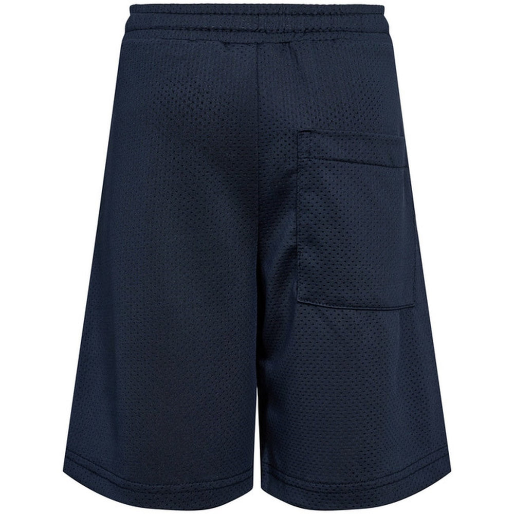 Oversized shorts in dark blue mesh material with elastic trim and ties at the waist. Fire roof on left leg. Made of 92% polyester and 8% spandex. Follow the washing and use instructions for best results. Perfect for play and fun!
