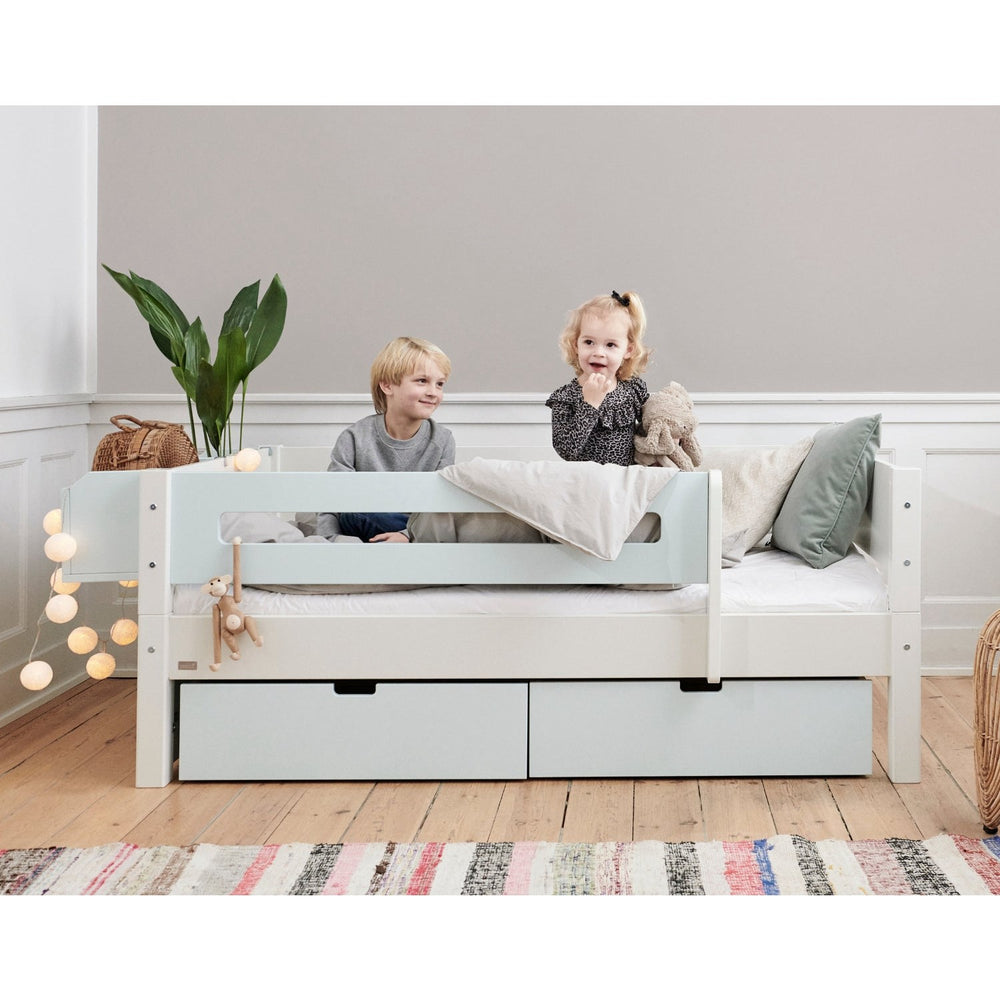 Introduce your little one to their first "real" bed with the Manis-h Snow White Mimer Børneseng. Perfectly designed for transitioning from a baby or junior bed, it features a low height and a front-mounted bed rail for safety and ease of access. Its sturdy slatted base and frame ensure a secure sleep, while the spacious drawers underneath provide ample storage for toys and bedding. This bed not only offers a comfortable sleep environment but also encourages independence and organization in your child's bedroom. Materials: MDF & Beech wood Measurements: 90 x 200