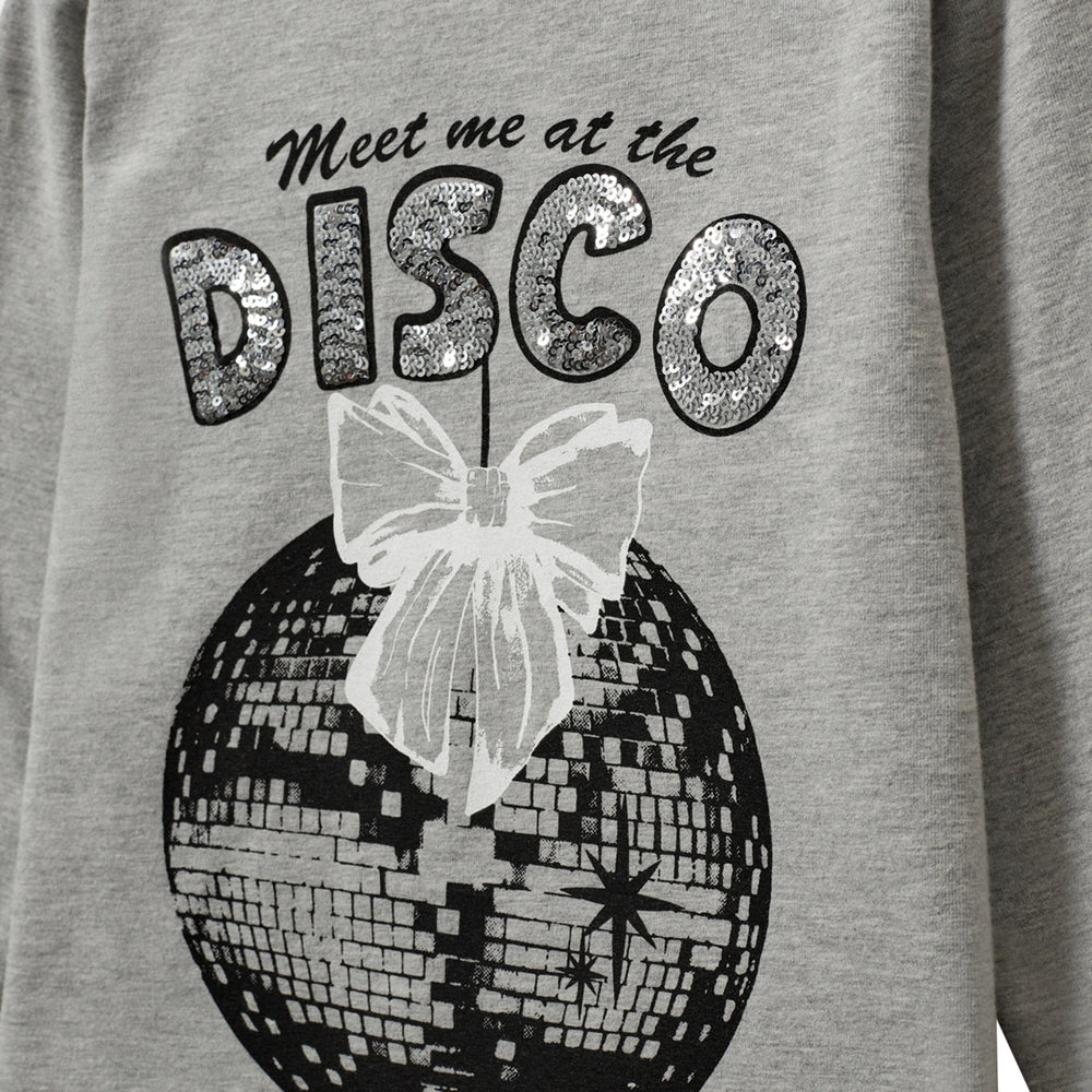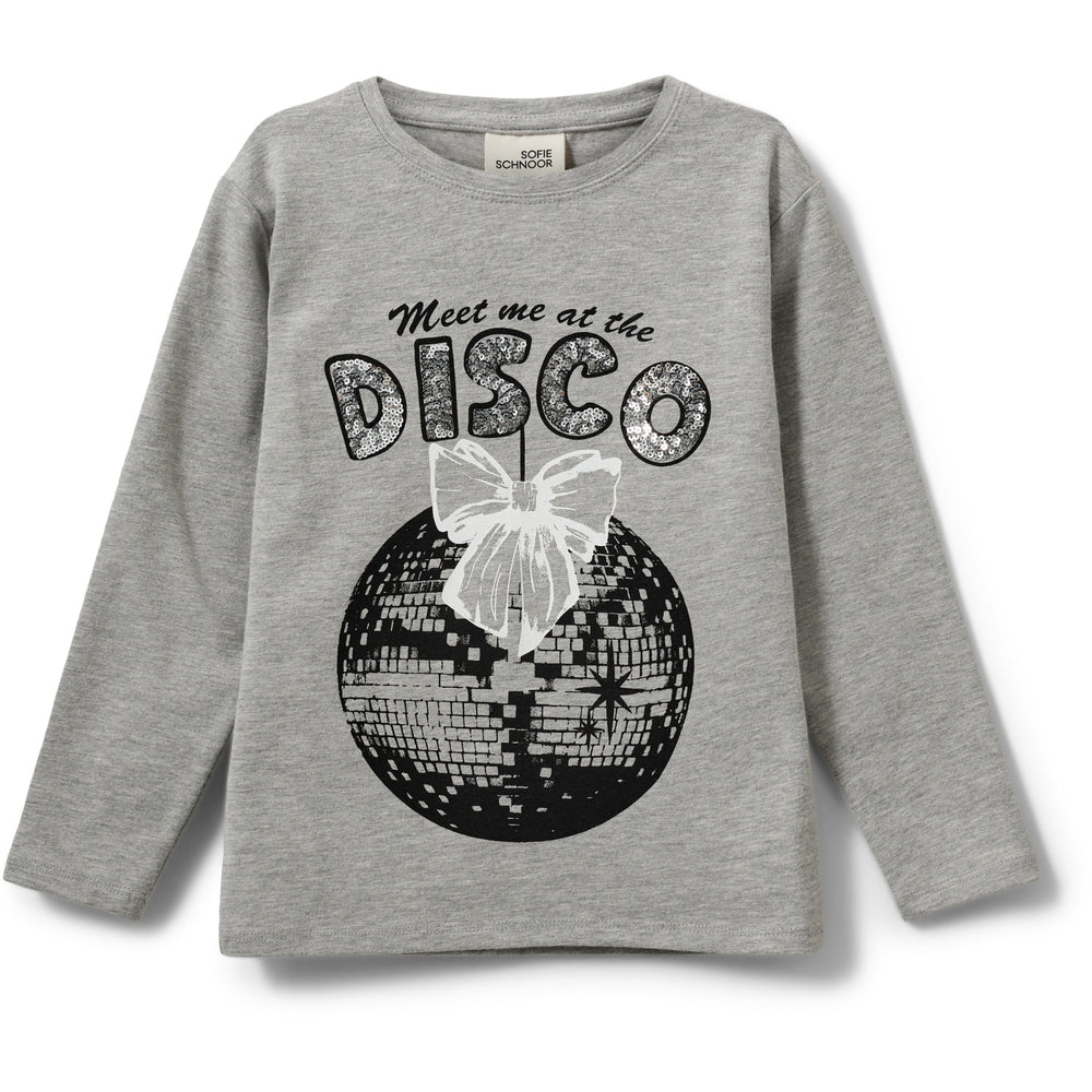 Add a fun tone to your child's wardrobe with this grey PenillaSK blouse from Sofie Schnoor. Designed with an eye-catching disco ball and a charming bow, as well as the text "Meet me at the DISCO". This blouse is made from a comfortable blend of cotton and elastane, ensuring a comfortable fit with its round neck and regular fit. Ideal for both play and festive occasions. Materials: 95% Cotton 5% Elastane Washing instructions: Remember to follow washing and user instructions Long-sleeved t-shirt in soft jersey Print with disco ball and bow, and the text "Meet me at the DISCO" Round neck Regular fit A blend of cotton and elastane