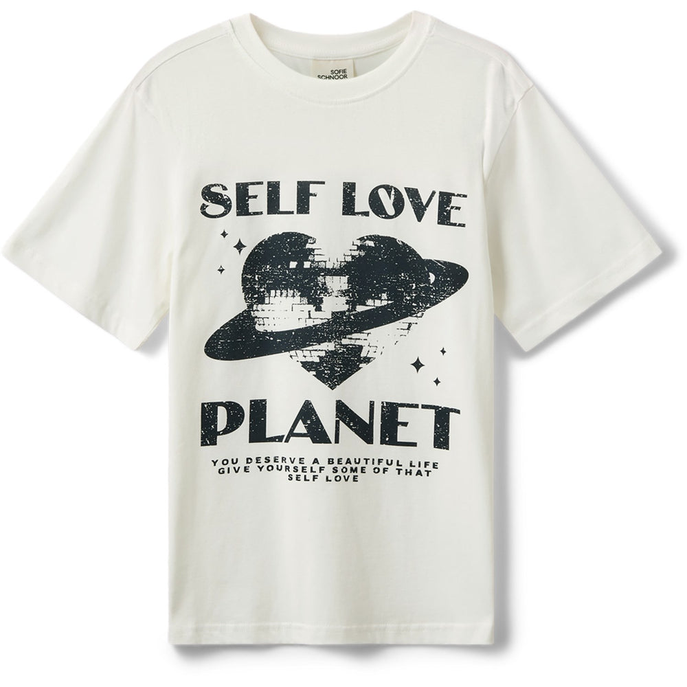 Let your child shine in this Sofie Schnoor Snow White ZenaSY T-shirt! With its classic fit and comfortable round neckline, it's perfect for everyday wear and play. On the front, a large and colorful print adorns with the text "Self Love Planet" along with a fun disco heart that adds a playful touch. This T-shirt combines comfort and style, so your child can feel comfortable and look amazing every day!